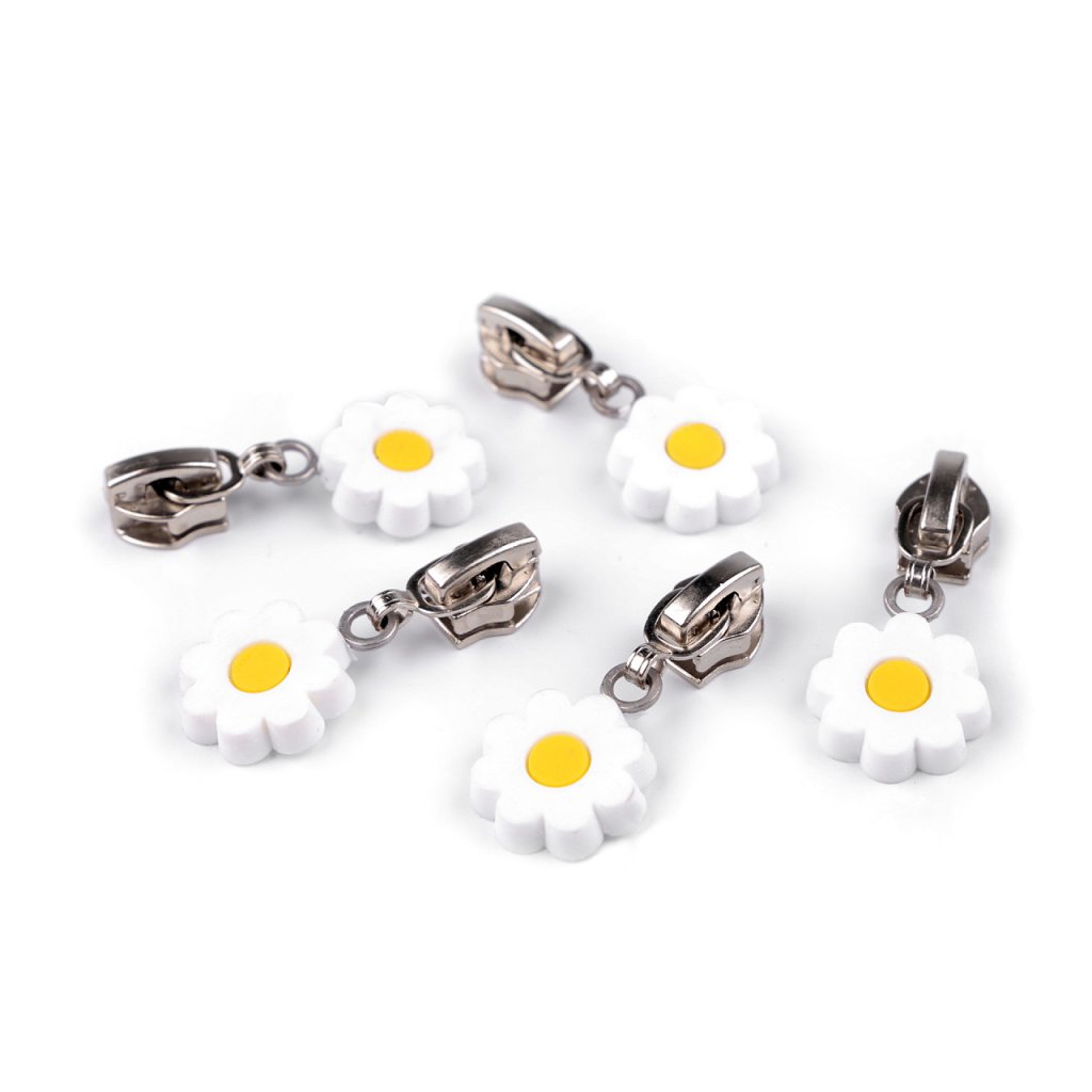 Kovový jezdec má silikonové táhlo ve tvaru květu. Je určený ke spirálovým zipům o šíři 6 mm v metráži, které u nás najdete pod kódy 750503, 790304, 800963, 750994, 740911, 790305, 050714.