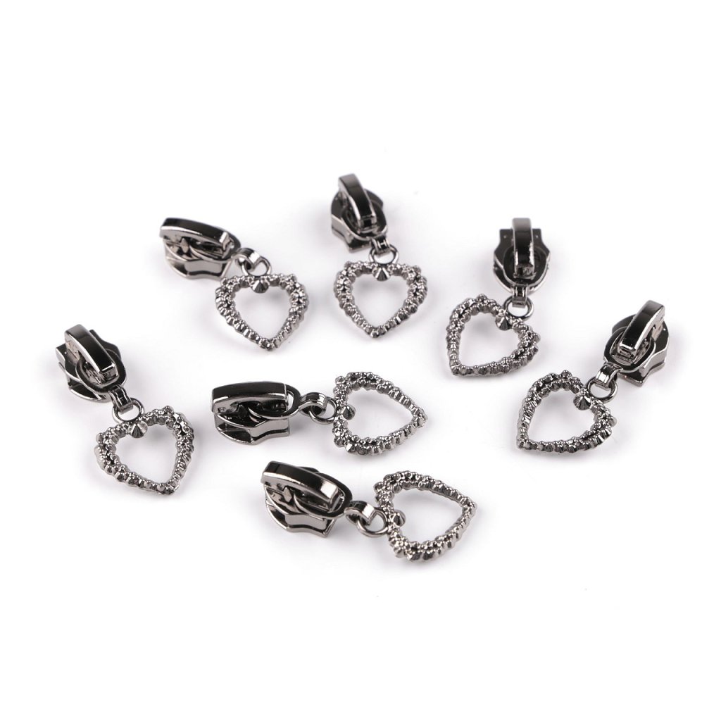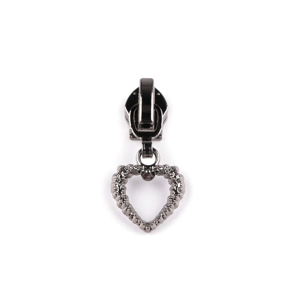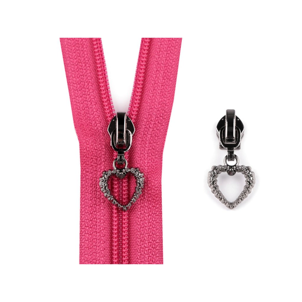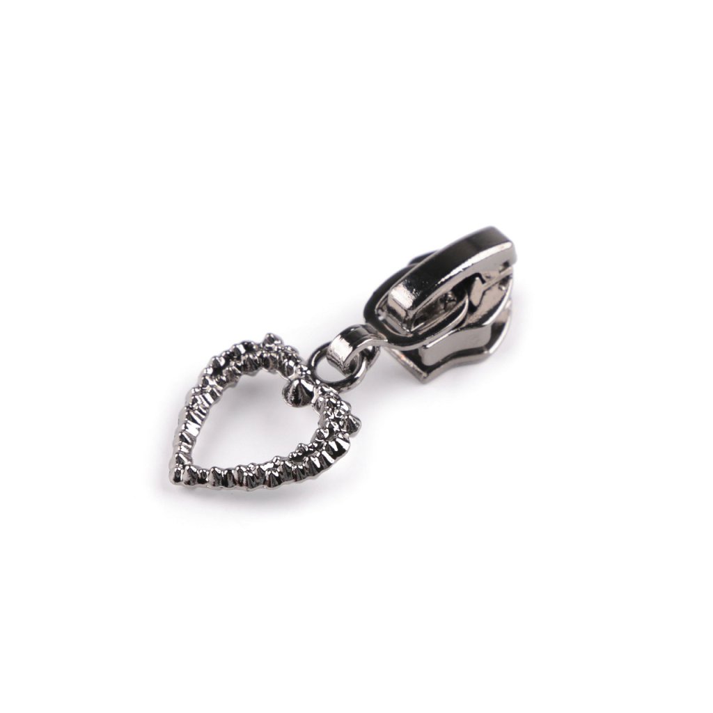 Kovový jezdec s ozdobným táhlem je určený ke spirálovým zipům No 7 v metráži, které u nás najdete pod kódy 750503, 790304, 800963, 750994, 790305. Táhlo má tvar srdce.
