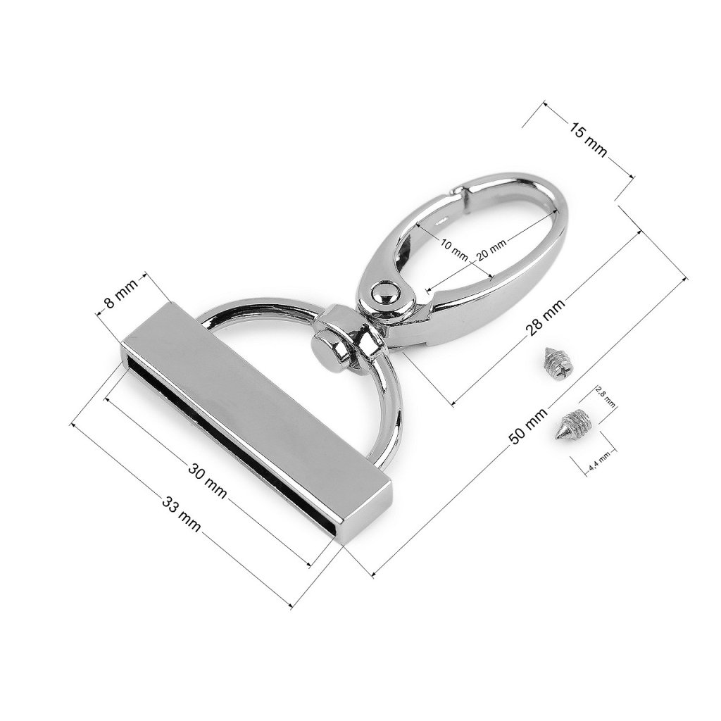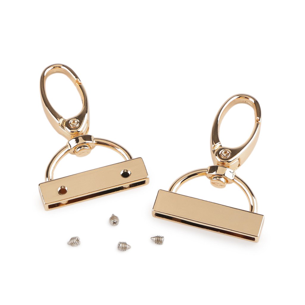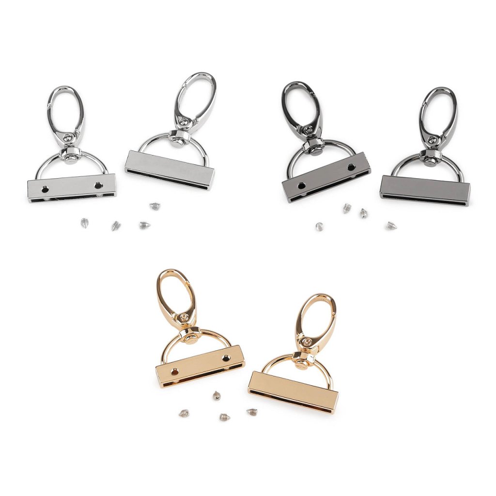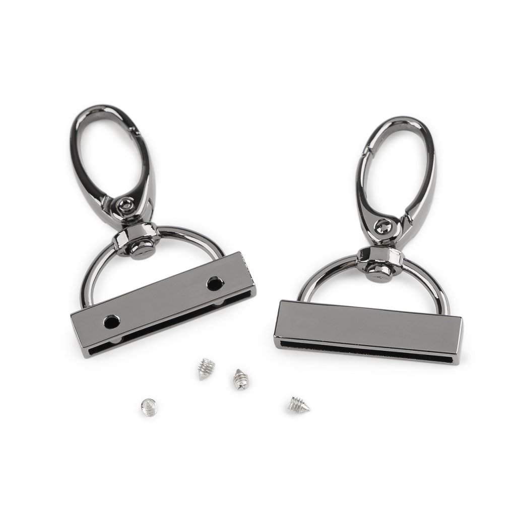 Koncovka na popruhy s otočnou karabinou má vysoký lesk. Přilepíte do ní konec popruhu či jiného materiálu (s tloušťkou do 2,5 mm), který následně uchytíte přiloženými šroubky.