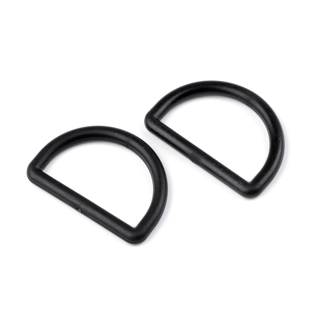 Plastový polokroužek má nižší hmotnost než kovový. Je vhodný k uchycení ucha či popruhu kabelky, tašky nebo batohu.