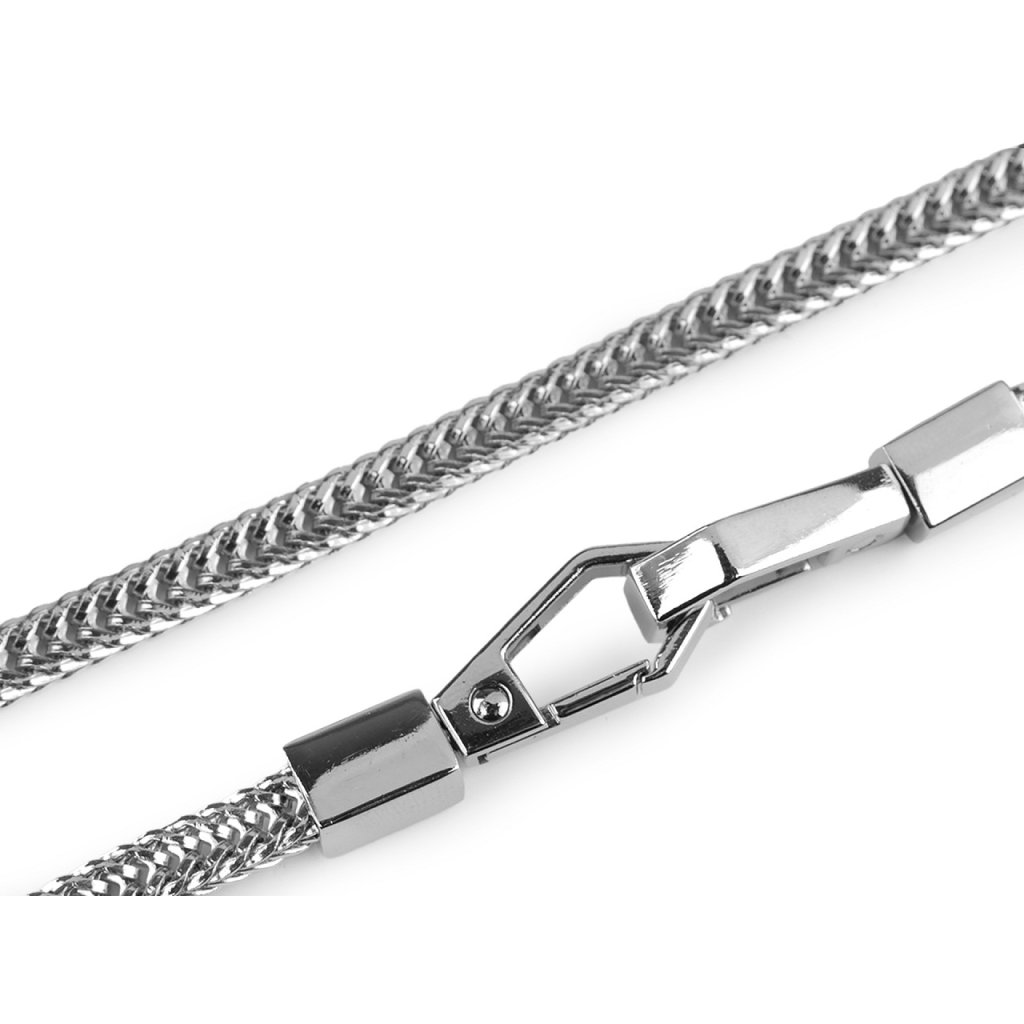 Plochý řetízek vyniká svým kvalitním zpracováním a vysokým leskem. Využijete ho na menší kabelky a psaníčka. Na obou jeho koncích najdete připevněné karabinky, které mají nevšední hranatý design.