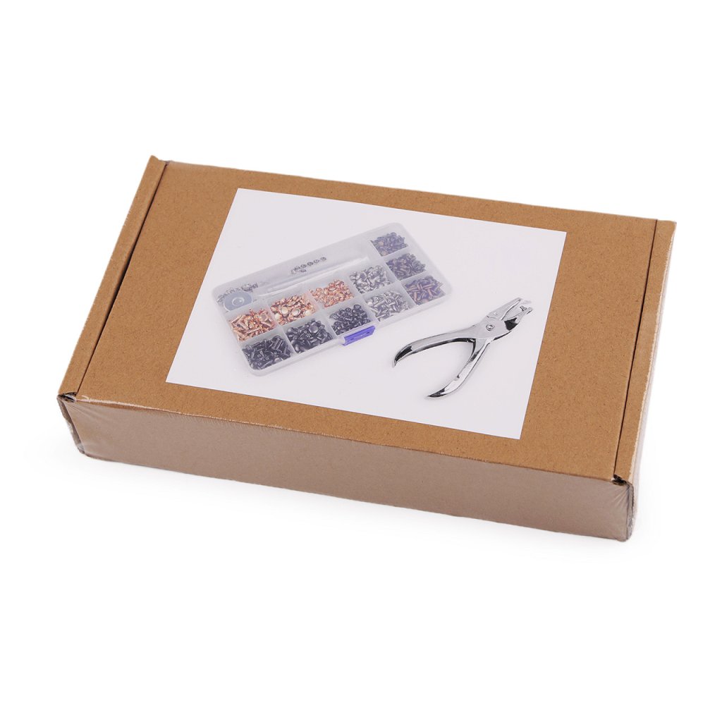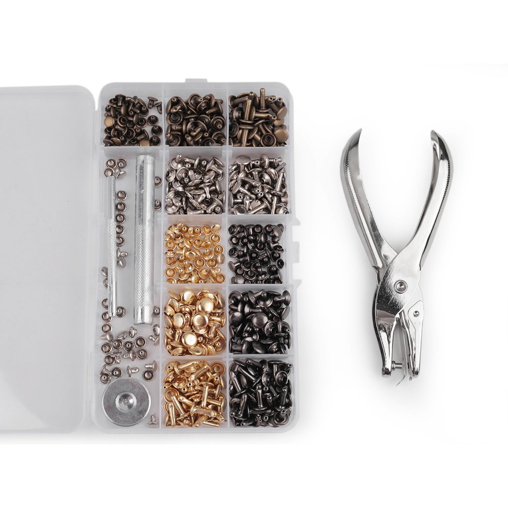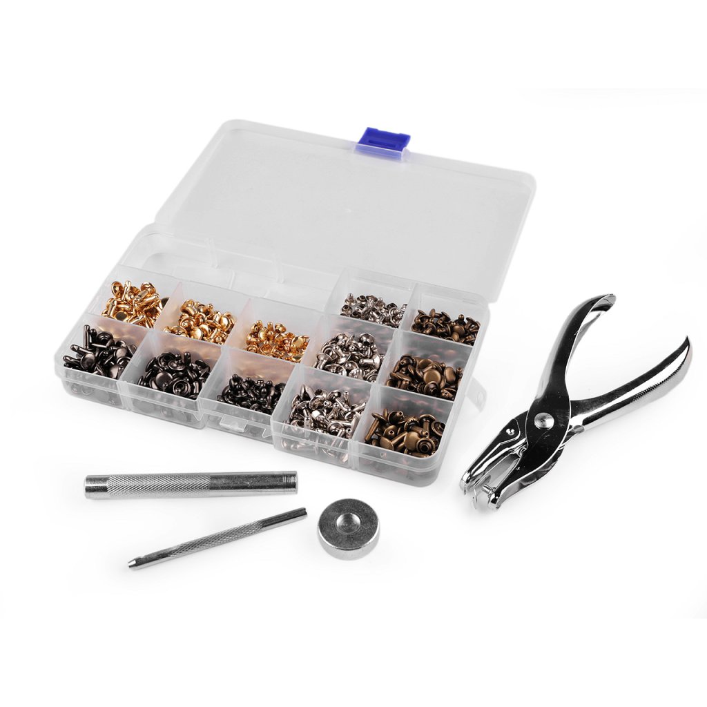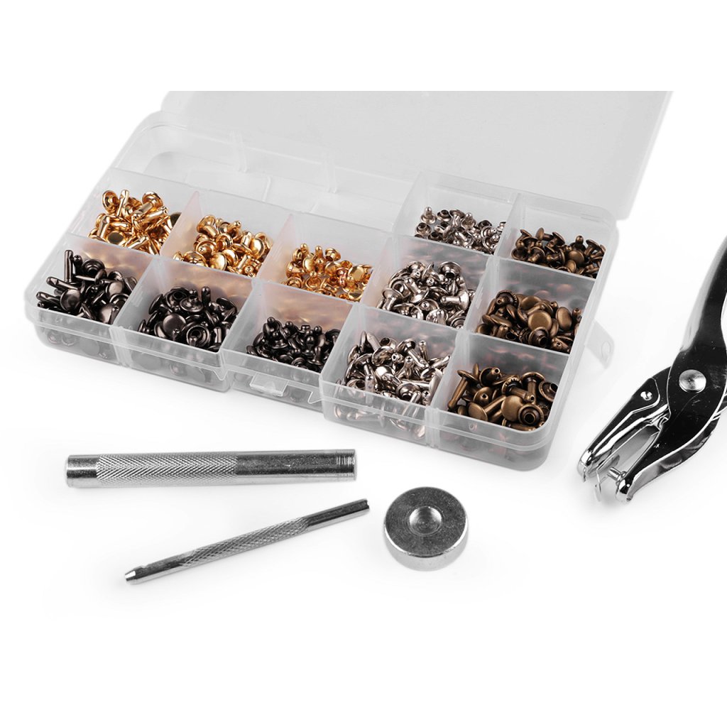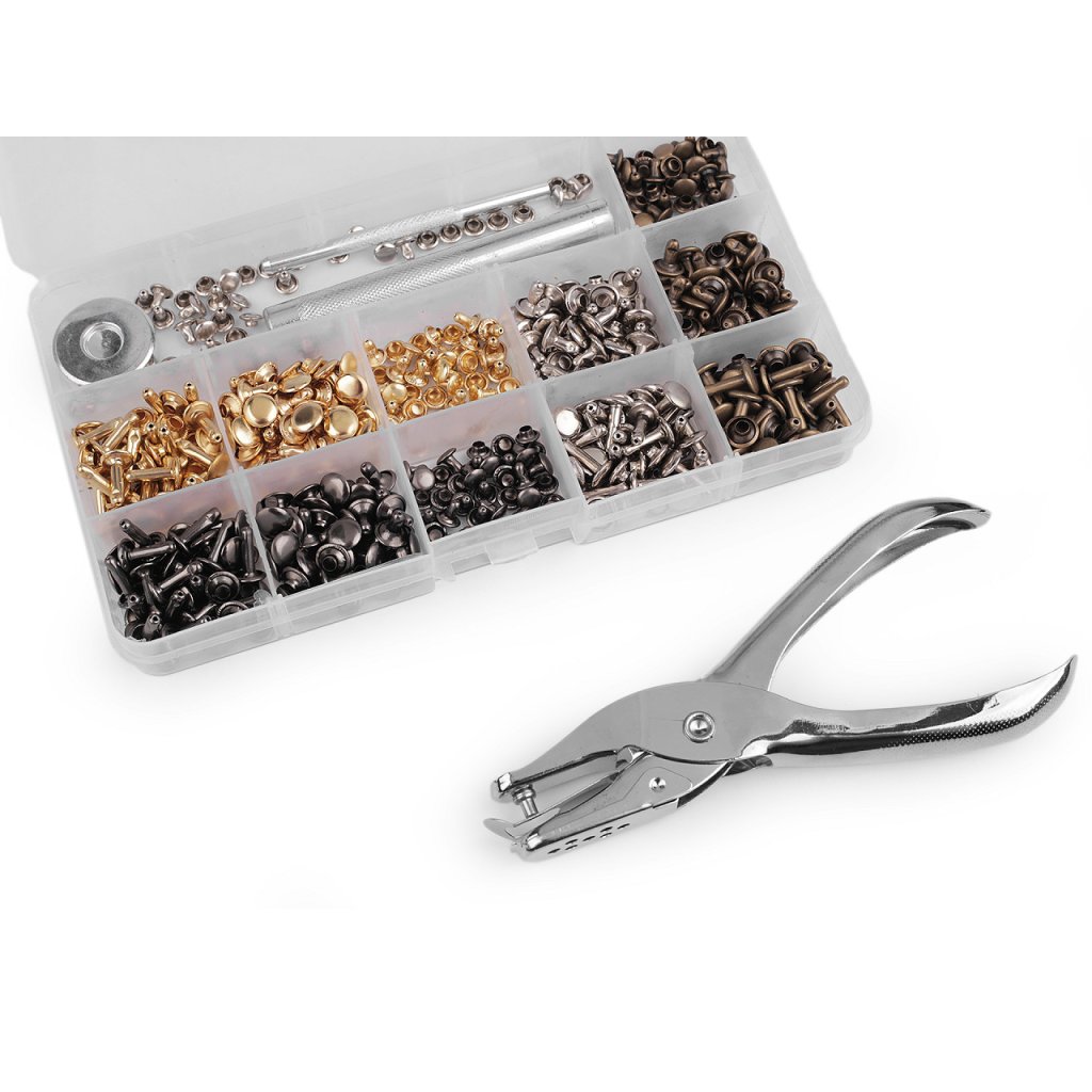 V praktickém boxu najdete nýty ve 4 barevných provedeních (zlatá, staromosaz, nikl a černý nikl) a ve 3 velikostech po 20 párech (1 pár = dvě části).