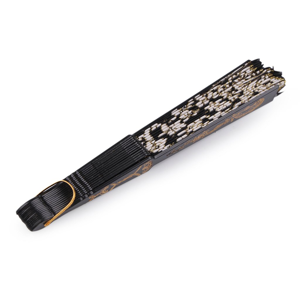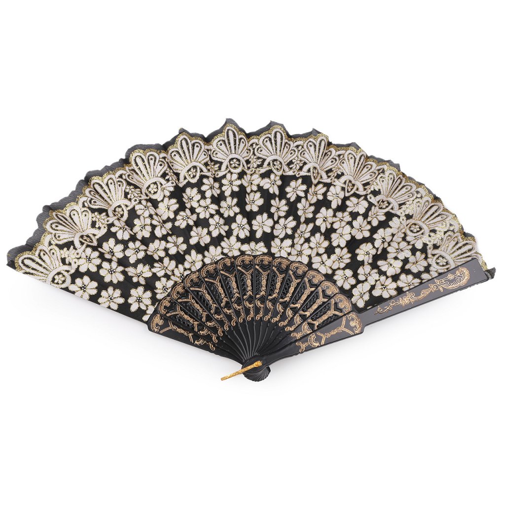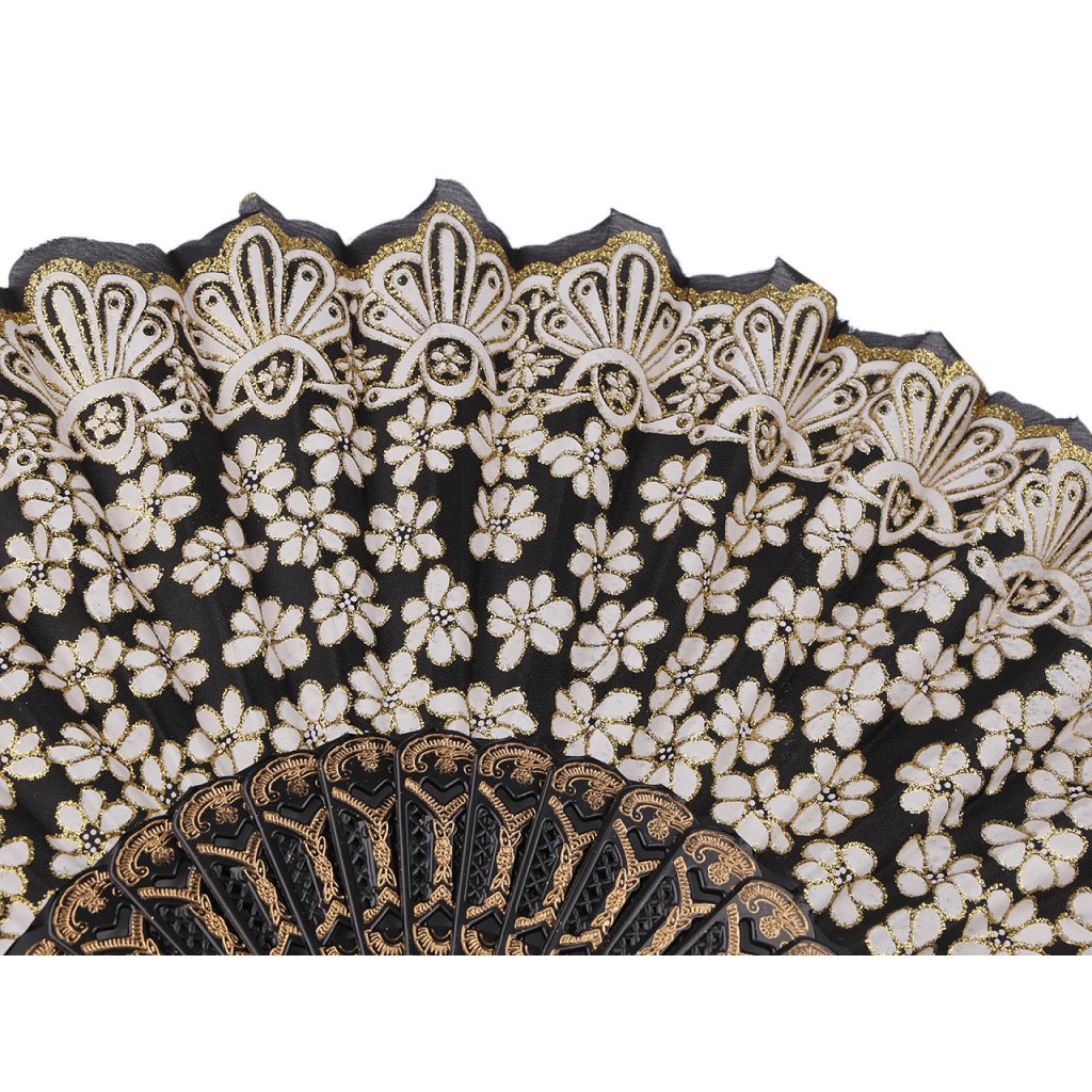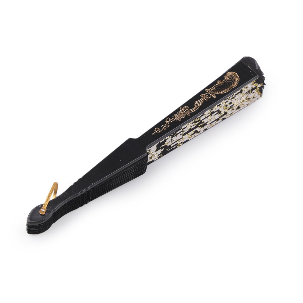 Textilní vějíř s glitry se hodí na společenské události, karnevaly i různá taneční vystoupení. Rukojeť je plastová s poutkem.
