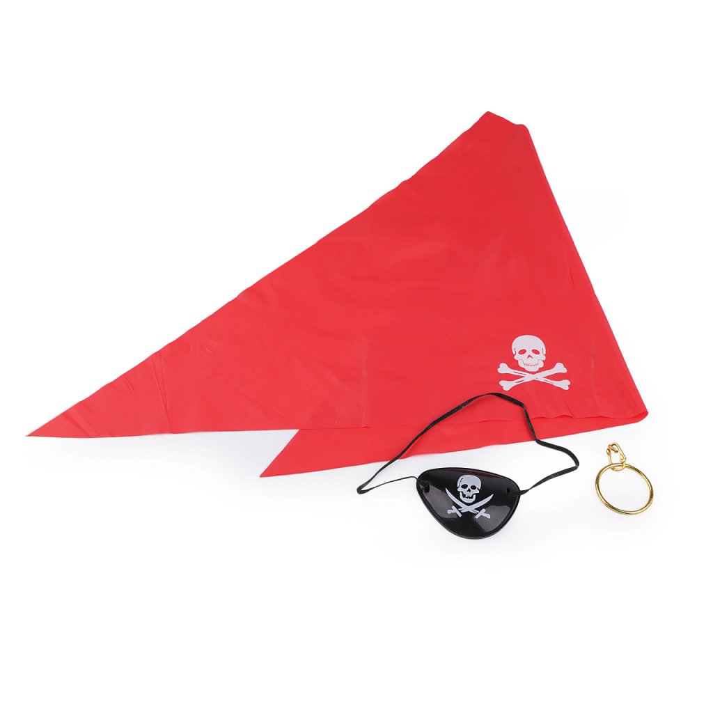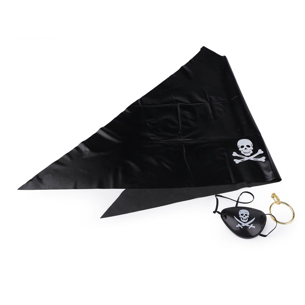 Pirátská karnevalová sada obsahuje plastovou pásku přes oko, šátek na hlavu a připínací zlatou náušnici. Je skvělá na karnevaly, oslavy, Halloween i tématické párty.