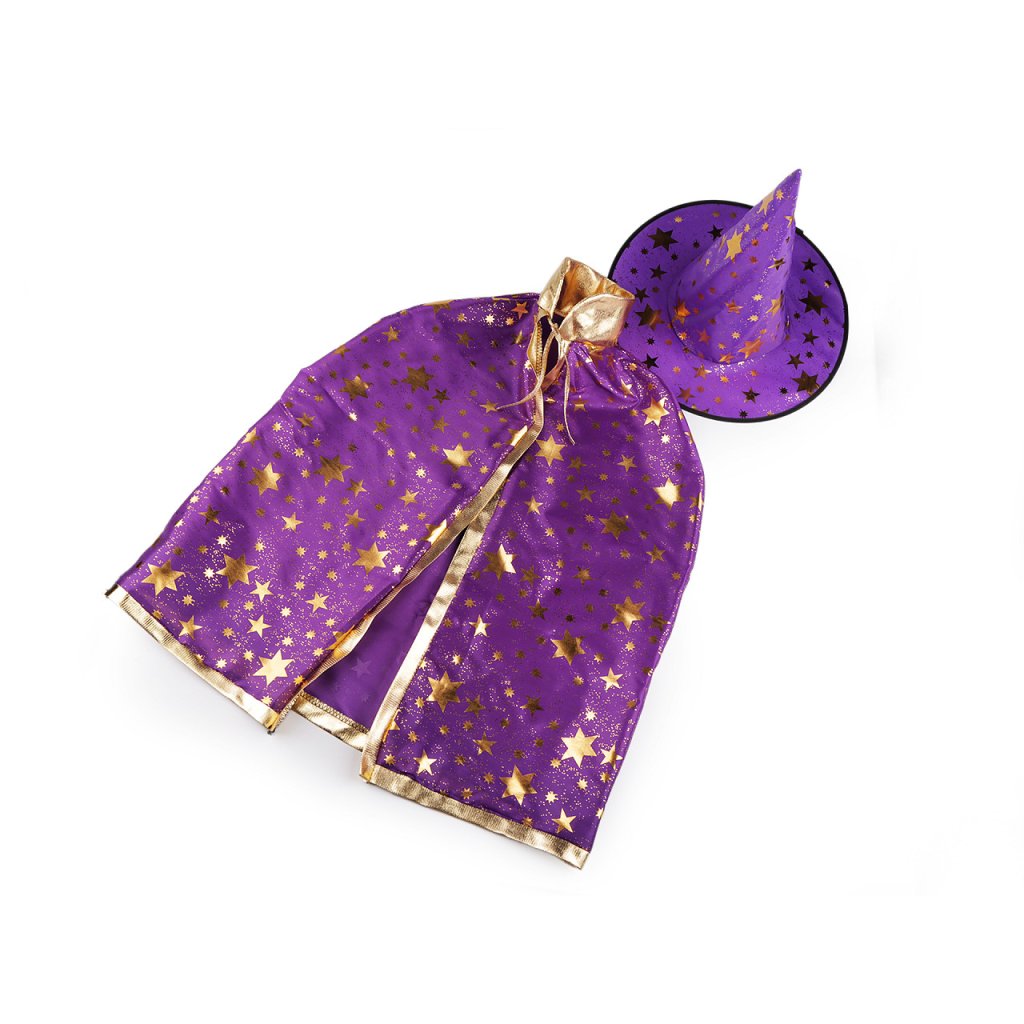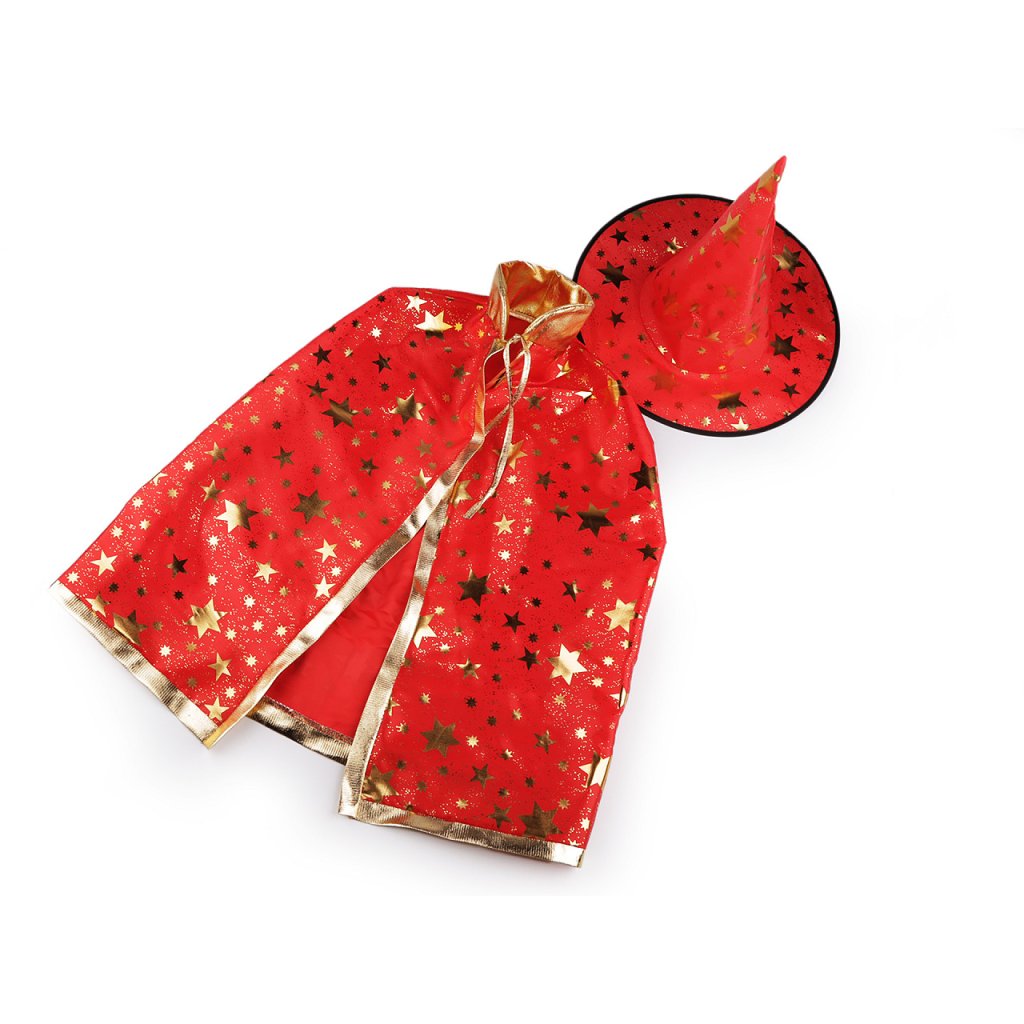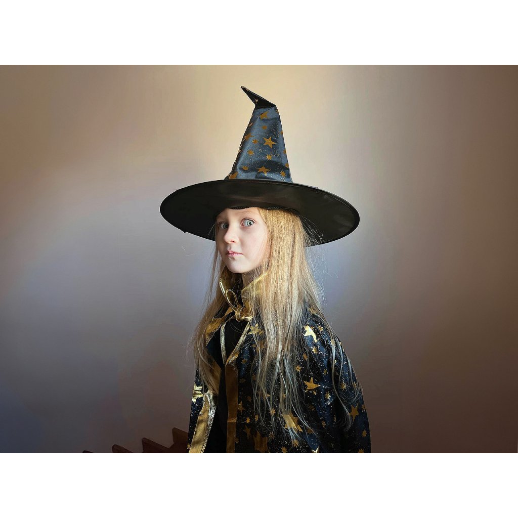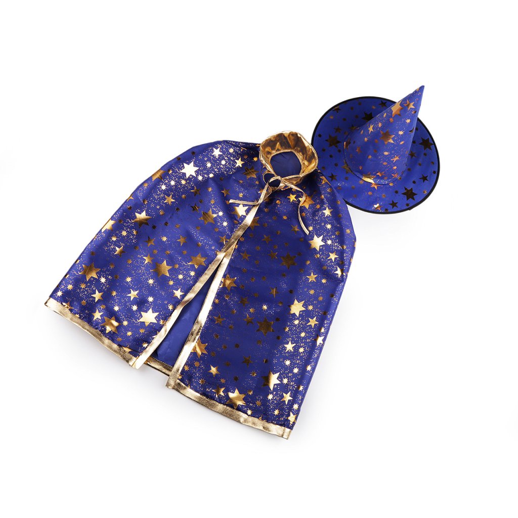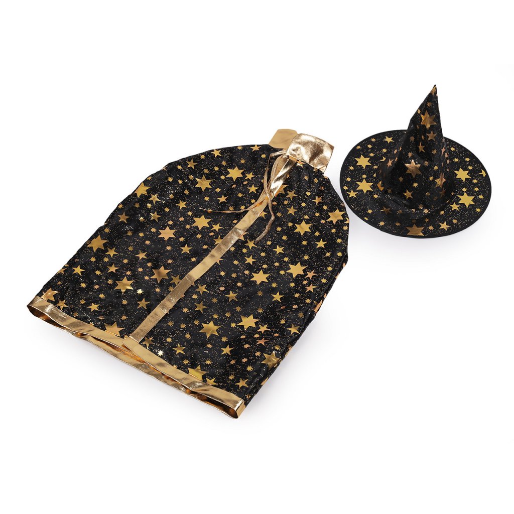 Dětský čarodějnický karnevalový kostým se skládá z klobouku a pláště. Jeho nositel získá úchvatný vzhled čaroděje, kouzelnice, mága nebo černokněžníka. Klobouk dobře drží tvar. Plášť je pevný, s límcem a zavazováním kolem krku. Kostým je ozdobený metalickým potiskem hvězd.