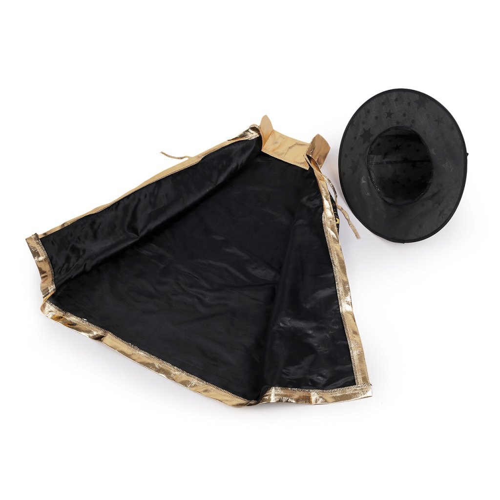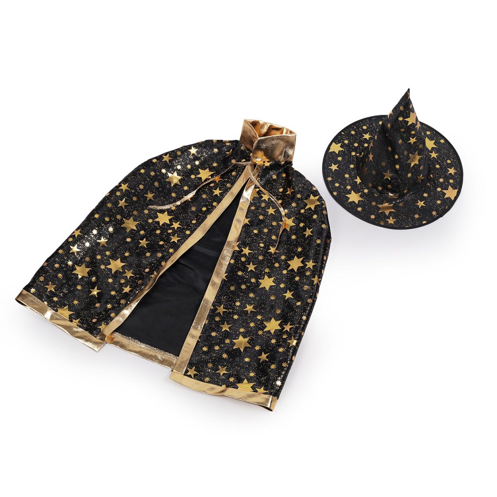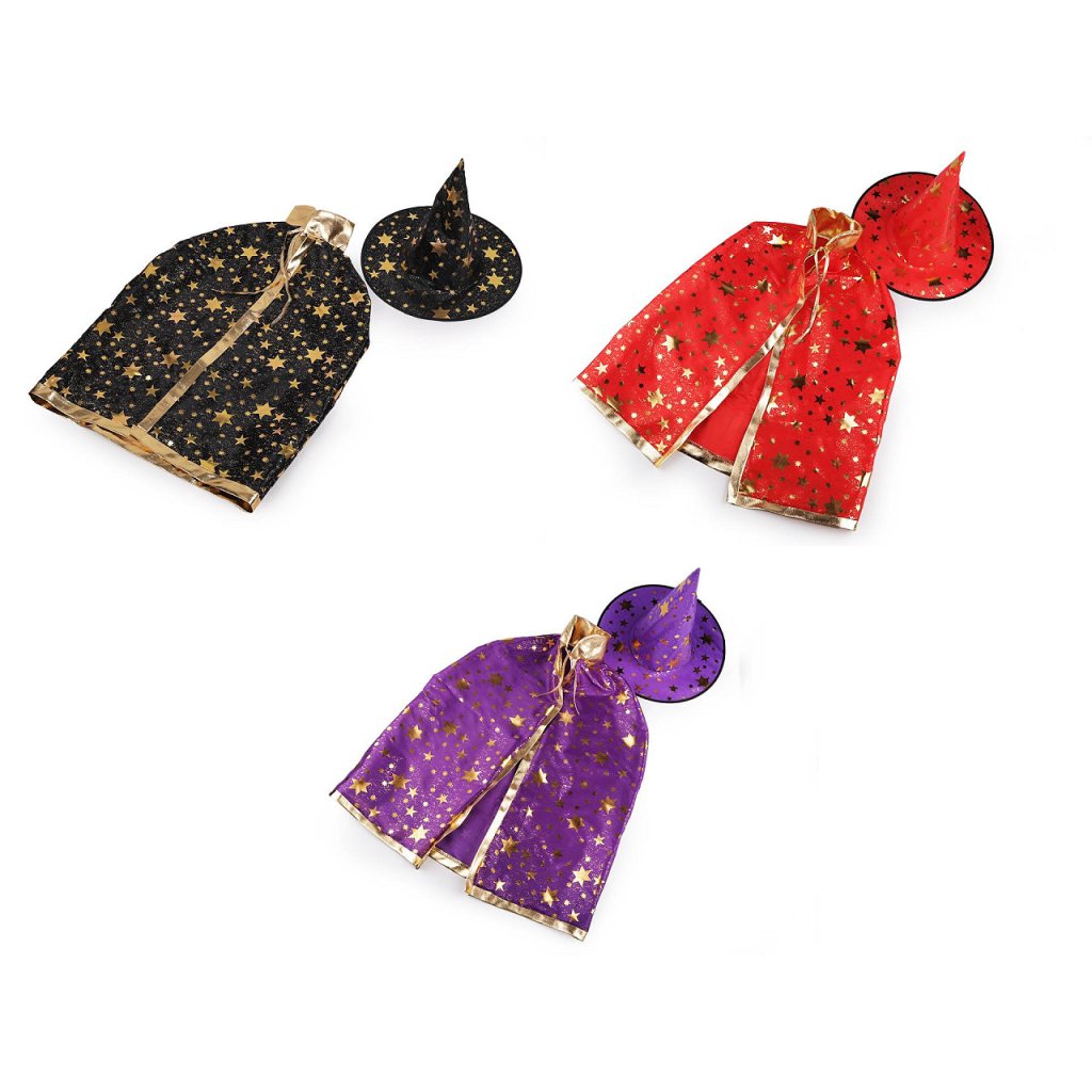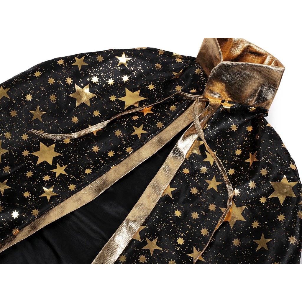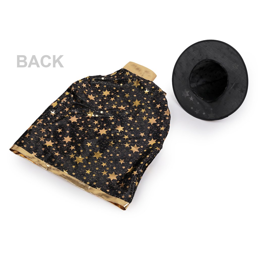 Dětský čarodějnický karnevalový kostým se skládá z klobouku a pláště. Jeho nositel získá úchvatný vzhled čaroděje, kouzelnice, mága nebo černokněžníka. Klobouk dobře drží tvar. Plášť je pevný, s límcem a zavazováním kolem krku. Kostým je ozdobený metalickým potiskem hvězd.