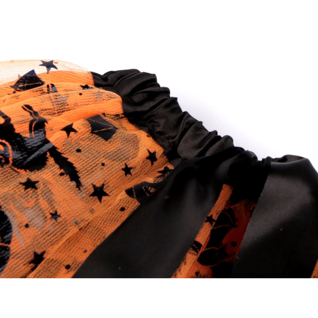 Dětský čarodějnický karnevalový kostým se skládá z tylové sukně a působivé čelenky s netopýrem. Sukýnka je dvojitá, horní vrstvu zdobí efektní potisk.