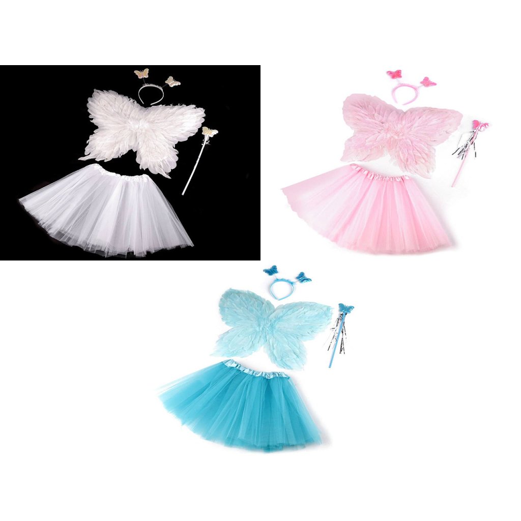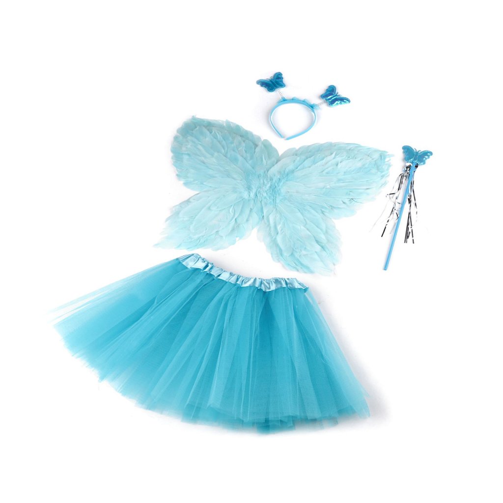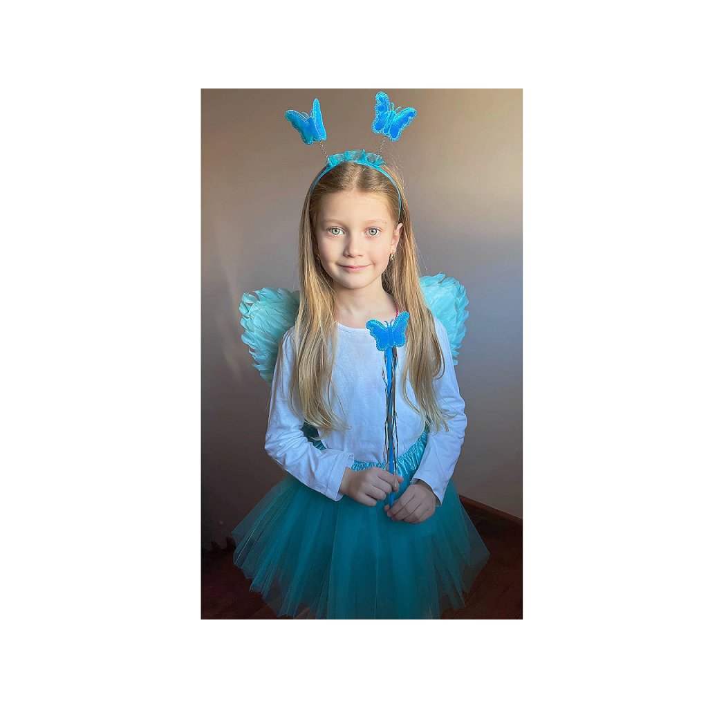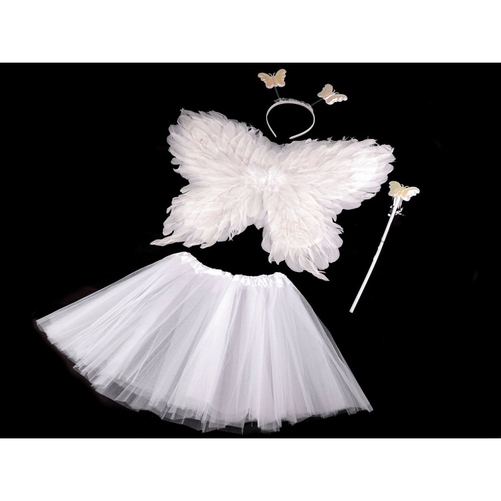 Sukýnka je v pase je pružná. Křídla jsou oboustranná, bohatě pokrytá peřím, nasazují se pomocí gumiček. Na čelence najdete motýlky na pružinkách.
