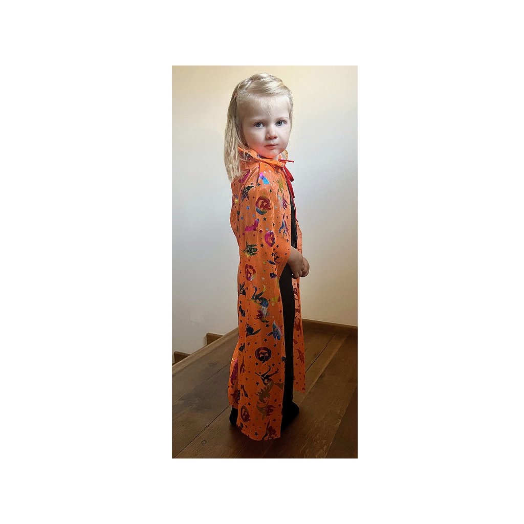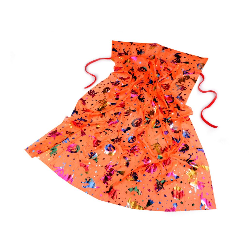 Karnevalový plášť má efektní metalický potisk. Promění vaše dítko v čaroděje, ježibabu, kouzelníka a podobné strašidelné postavy. Váže se pomocí šňůrek. Materiál je poloprůhledný.