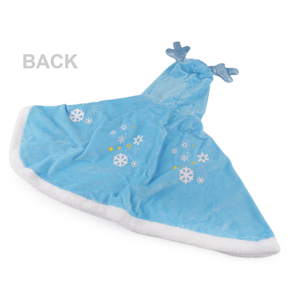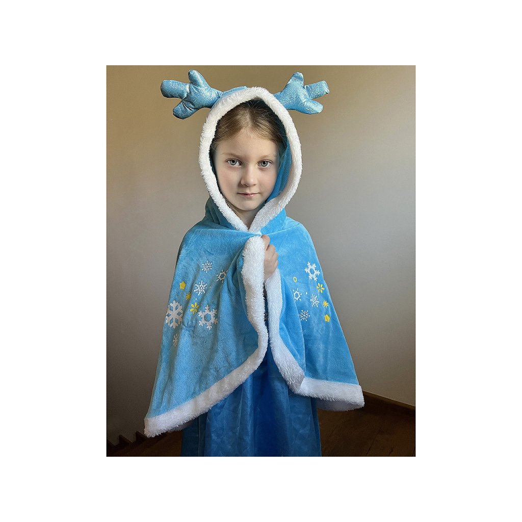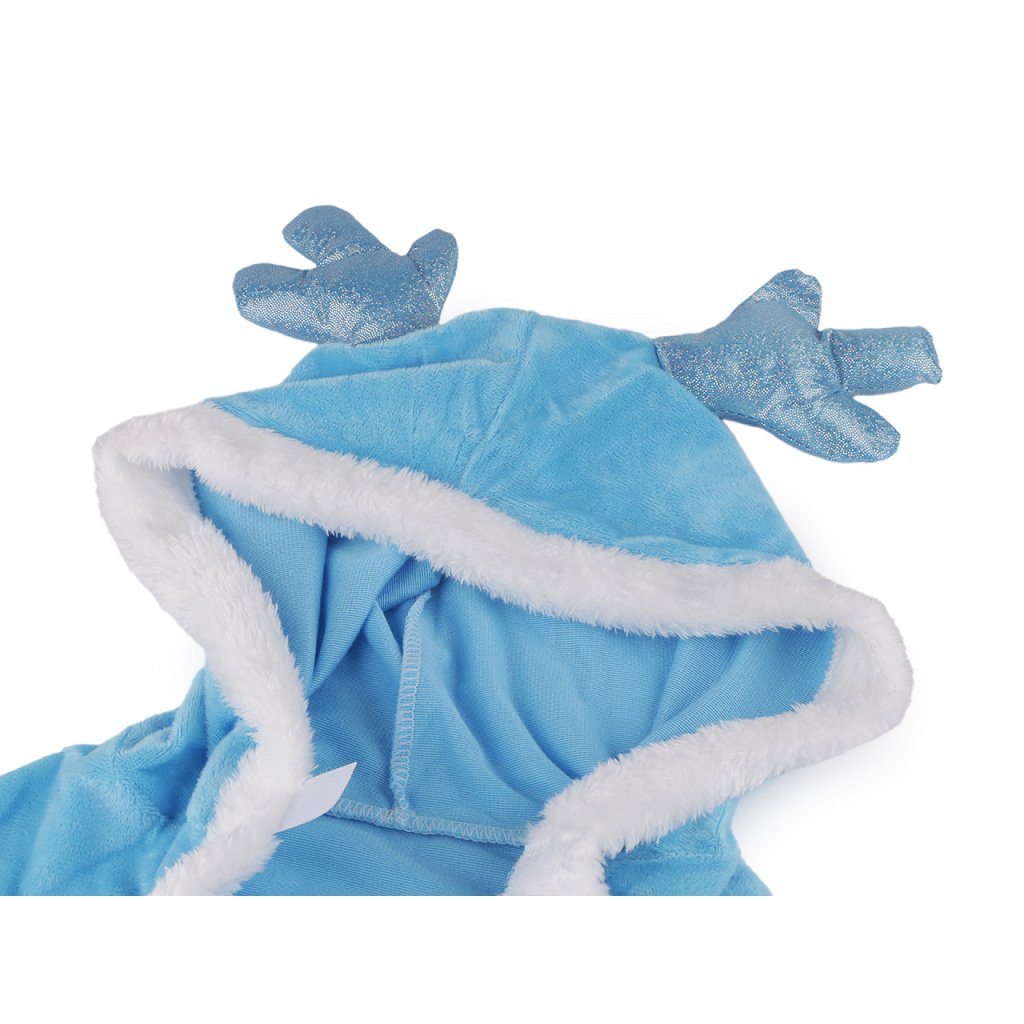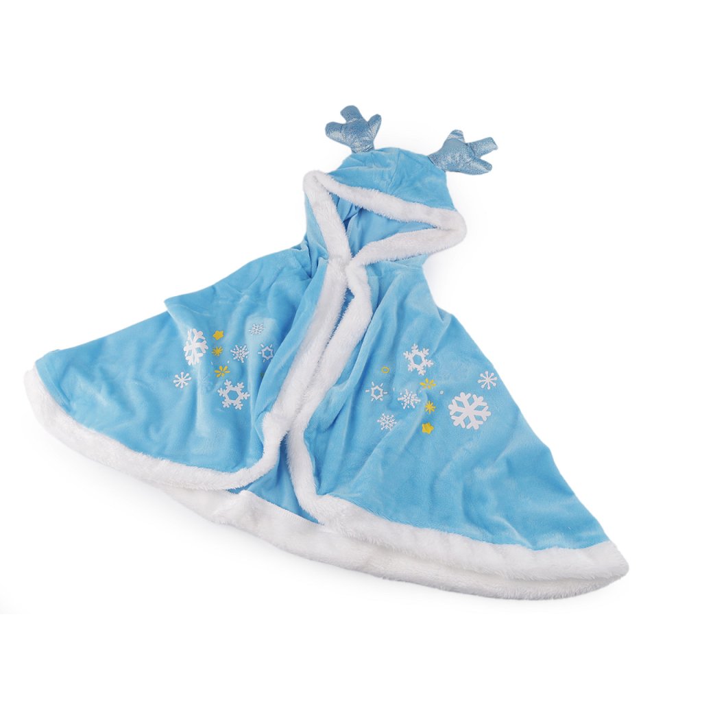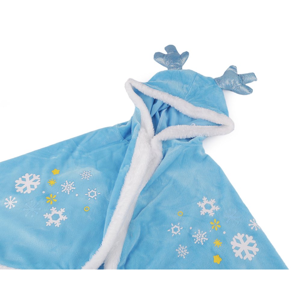 Karnevalový plášť pro malou ledovou královnu je měkký a velmi příjemný na dotek. Lemuje ho plyšová kožešinka, na kapuci jsou našité třpytivé rohy a pozoruhodným detailem je potisk sněhových vloček. Plášť se zapíná pomocí suchého zipu.