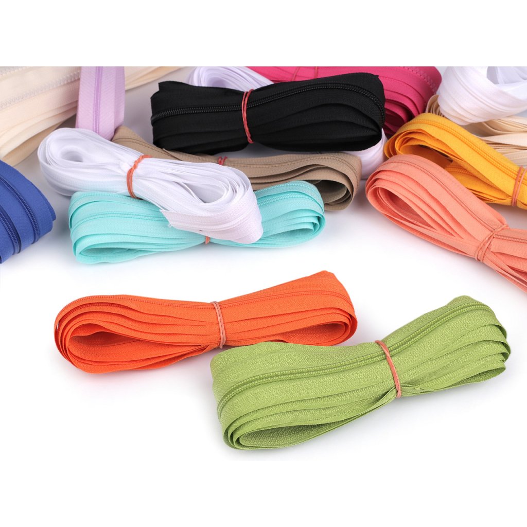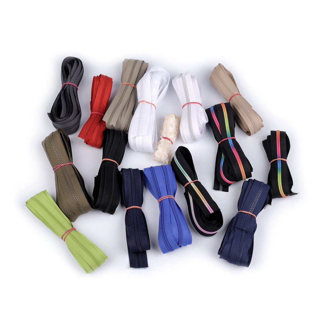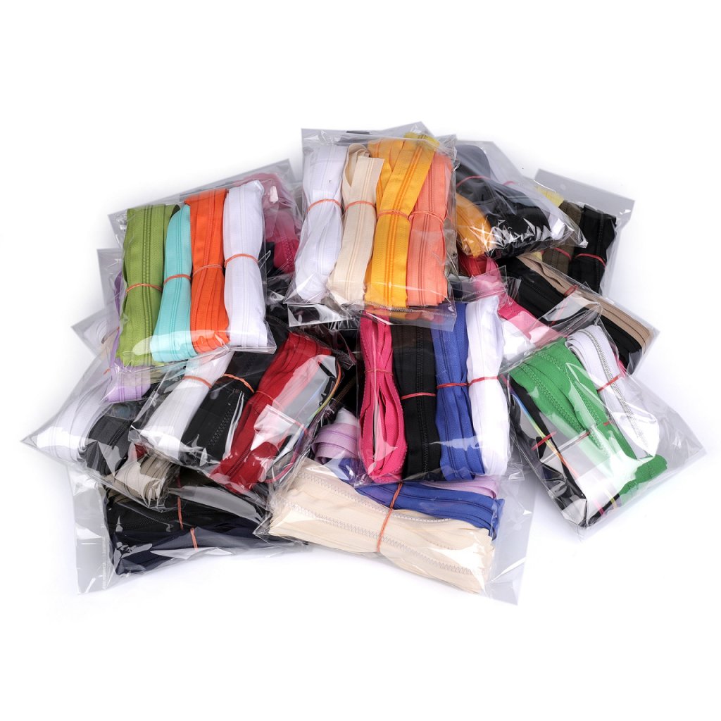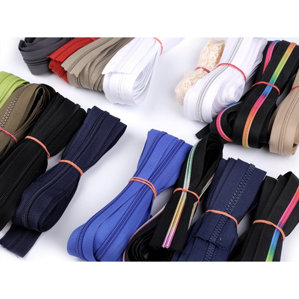 Balení metrážových zipů obsahuje zipy různých druhů, barev, šíře a délek. Najdete zde zipy kostěné, spirálové, krajkové, duhové atd.