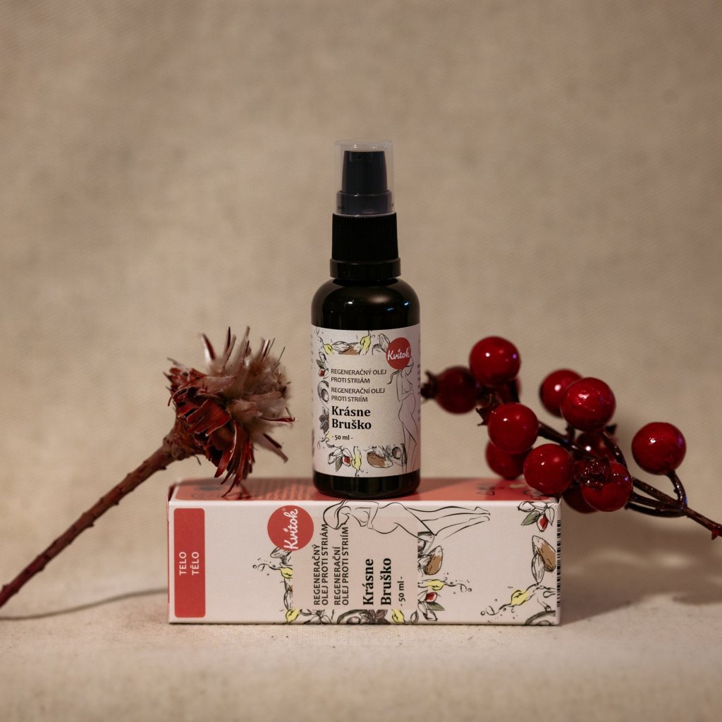 Těhotenství a rostoucí břísko přináší spoustu radosti, ale i drobné nepříjemnosti. Mezi ty patří především strie, které se na bříšku mohou objevit. V Kvitku proto namíchali 100 % přírodní regenerační tělový olej, který pomáhá pokožku udržovat hydratovanou a preventivně působí proti vzniku strií. Na pomoc si vzali několik silných spojenců v podobě šípkového, pšeničného, avokádového a exotického Sacha Inchi a tamanu oleje.. Neobsahuje žádné minerální oleje, konzervanty, syntetické parfémy či ropné deriváty.