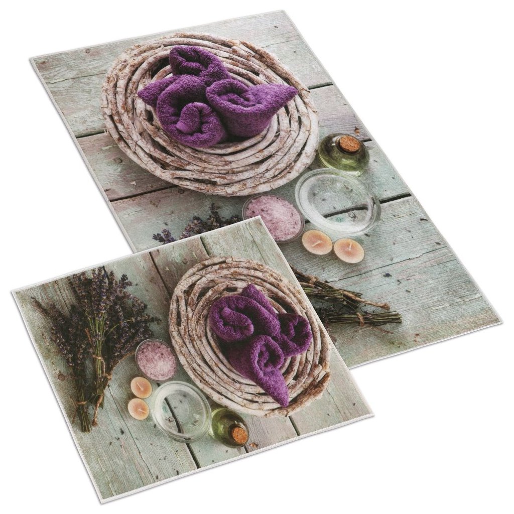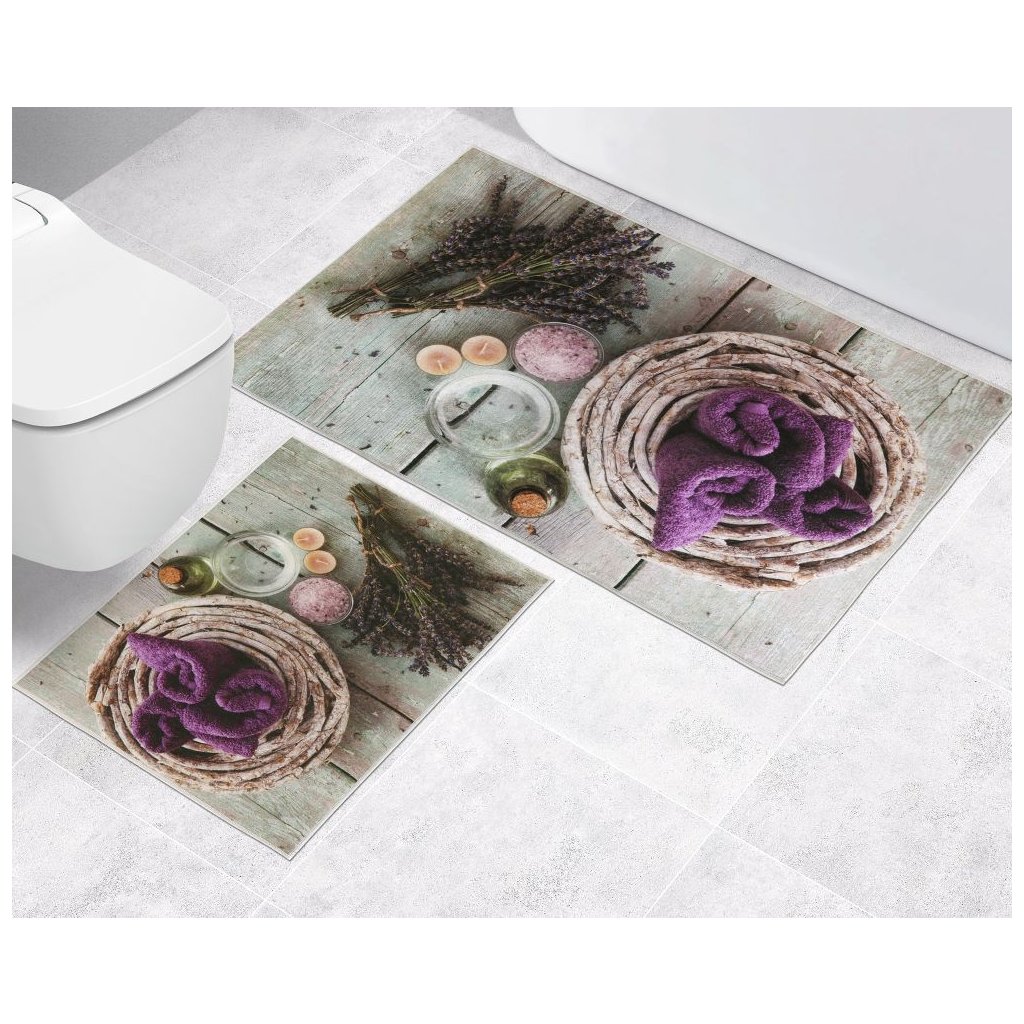 Koupelnová sada obsahuje předložku do koupelny a předložku před WC. Koupelnové předložky jsou vyrobeny z materiálu 100% polypropylen. Předložky nekloužou na podlaze díky protiskluzovému latexovému povrchu na rubní straně. Koupelnu Vám ozdobí velmi moderní 3D motiv levandulí a decentní dekorace. Předložky jistě skvěle doplní koupelnu laděnou do venkovského a Provence stylu.