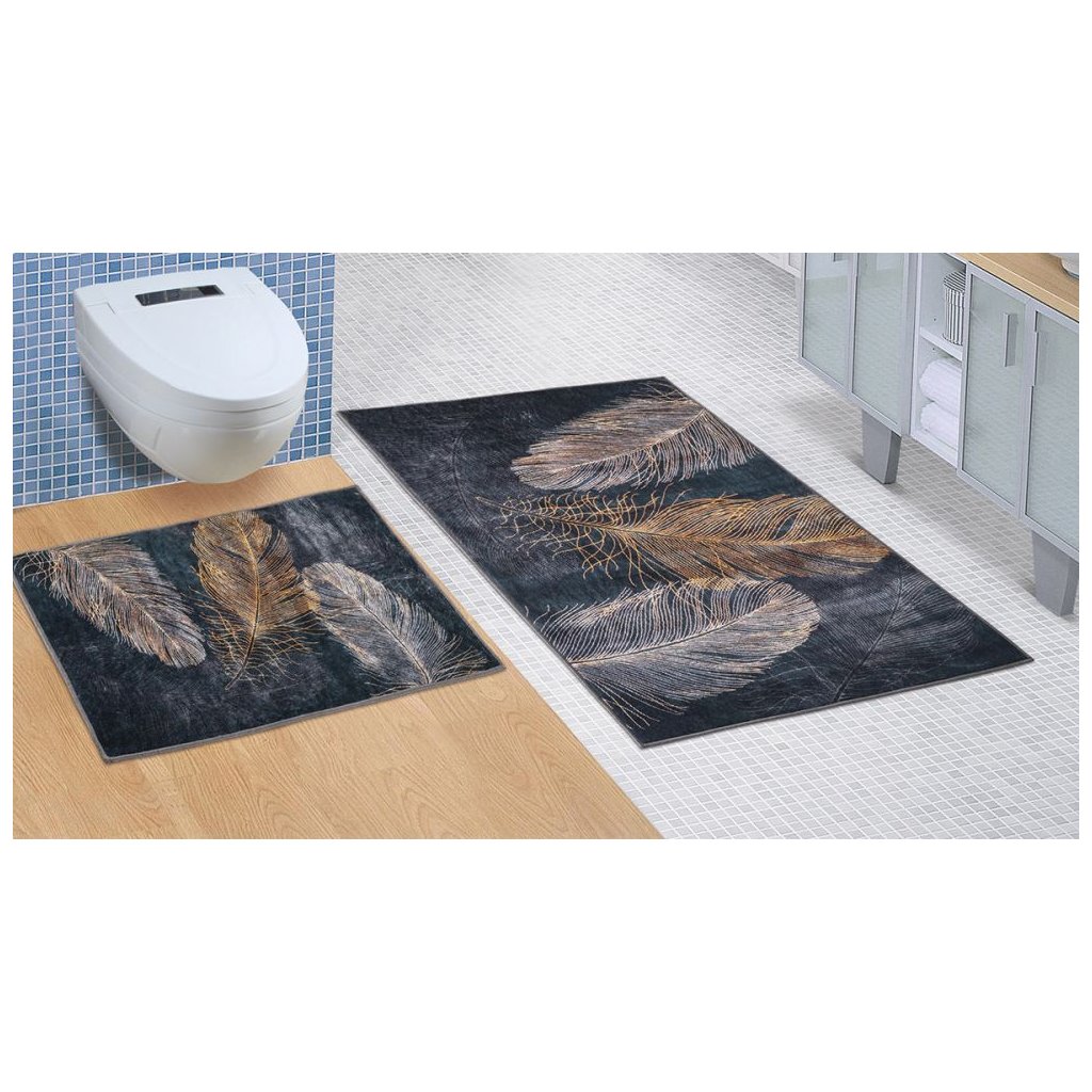 Koupelnová sada obsahuje předložku do koupelny a předložku před WC. Koupelnové předložky jsou vyrobeny z materiálu 100% polypropylen. Předložky nekloužou na podlaze díky protiskluzovému latexovému povrchu na rubní straně. Koupelnu Vám ozdobí decentní 3D motiv pírek. Předložky jistě skvěle doplní koupelnu v minimalistickém stylu.
