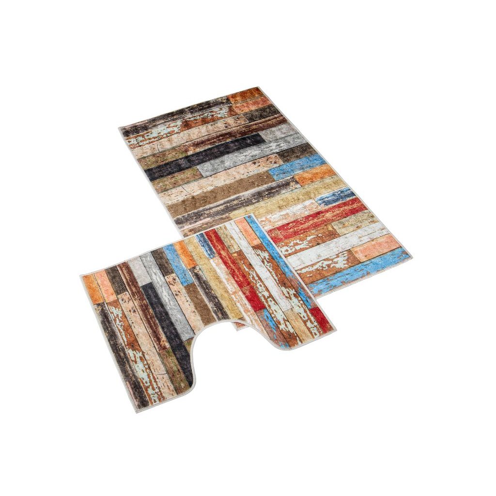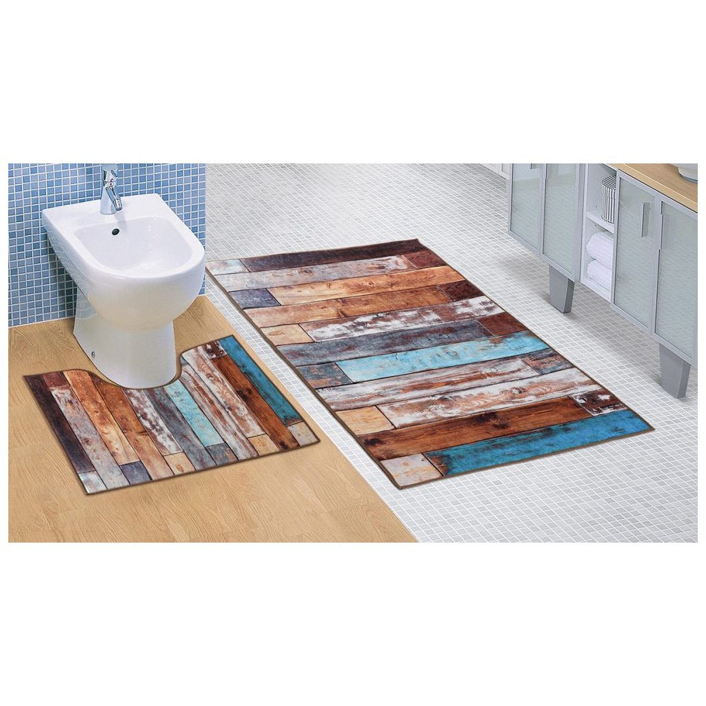Koupelnová sada obsahuje předložku do koupelny a předložku před WC. Koupelnové předložky jsou vyrobeny z materiálu 100% polypropylen. Předložky nekloužou na podlaze díky protiskluzovému latexovému povrchu na rubní straně. Koupelnu Vám ozdobí velmi moderní 3D motiv prkenné podlahy. Předložky jistě skvěle doplní koupelnu ve venkovském stylu.