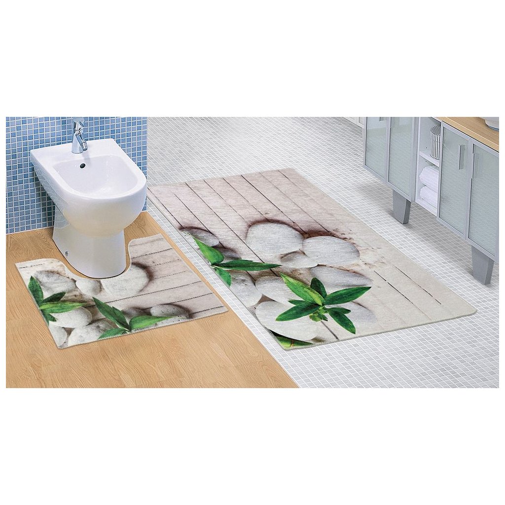 Koupelnová sada obsahuje předložku do koupelny a předložku před WC. Koupelnové předložky jsou vyrobeny z materiálu 100% polypropylen. Předložky nekloužou na podlaze díky protiskluzovému latexovému povrchu na rubní straně. Koupelnu Vám ozdobí velmi moderní 3D motiv kamenů na prkené podlaze, který je doplněn o lístky bambusu. Předložky jistě skvěle doplní koupelnu laděnou do trendy barev jako je šedá, hnědá, zelená a béžová.