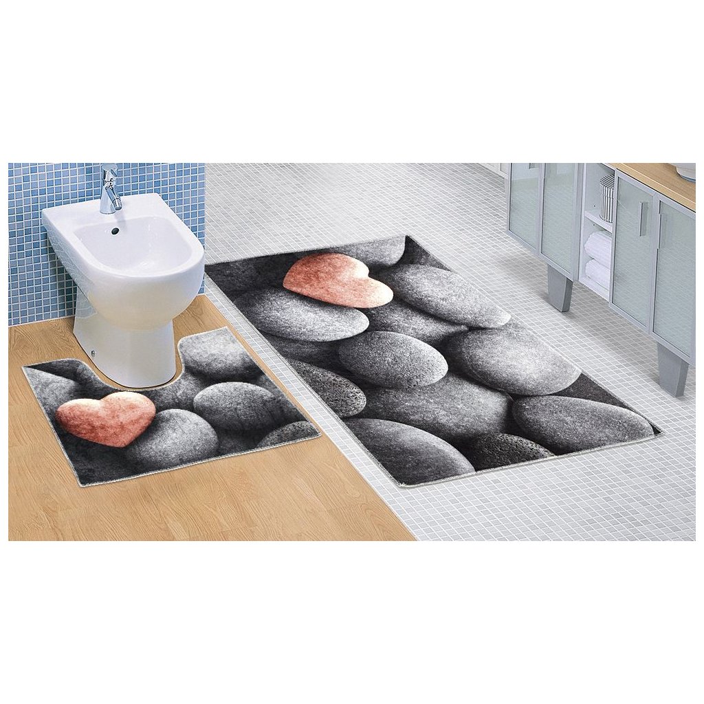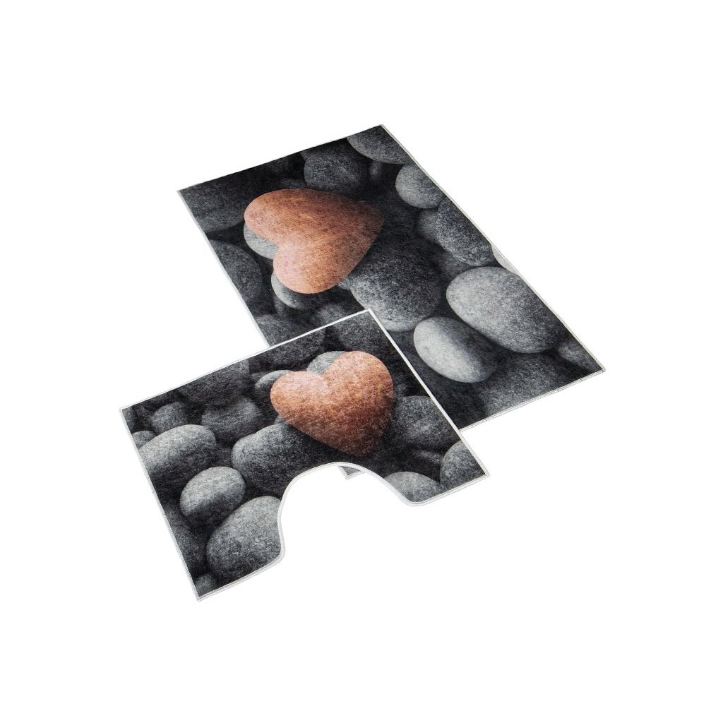 Koupelnová sada obsahuje předložku do koupelny a předložku před WC. Koupelnové předložky jsou vyrobeny z materiálu 100% polypropylen. Předložky nekloužou na podlaze díky protiskluzovému latexovému povrchu na rubní straně. Koupelnu Vám ozdobí velmi moderní 3D motiv tmavých kamenů, který je doplněn o béžové srdce. Předložky jistě skvěle doplní koupelnu laděnou do trendy barev jako je šedá, černá a béžová.