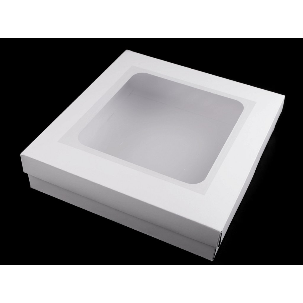 Čtvercová papírová krabice má výřez ve víku z průhledné fólie. Využijete ji na balení dárků, šátků, uložení baněk apod. Můžete si ji i dozdobit podle svého vkusu.