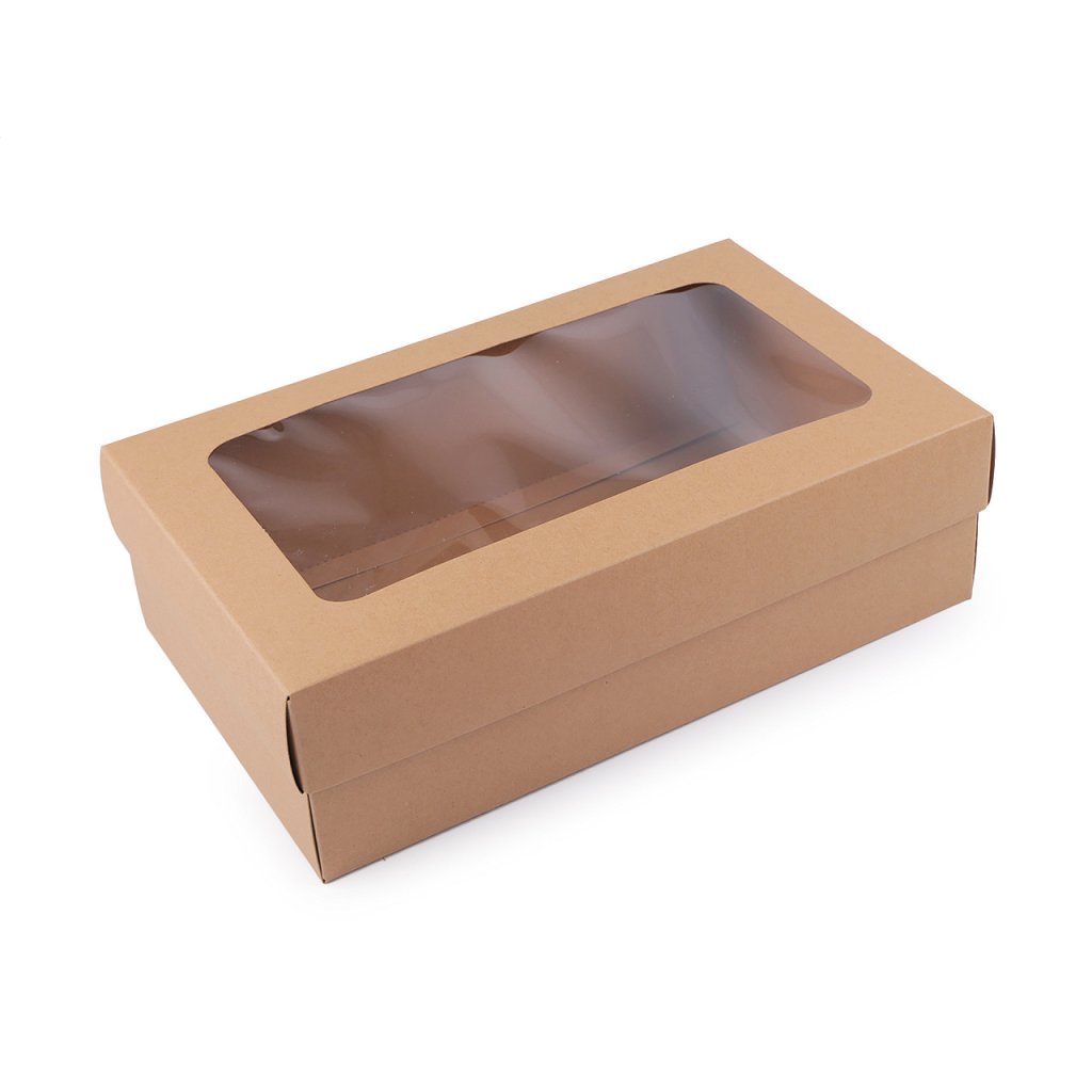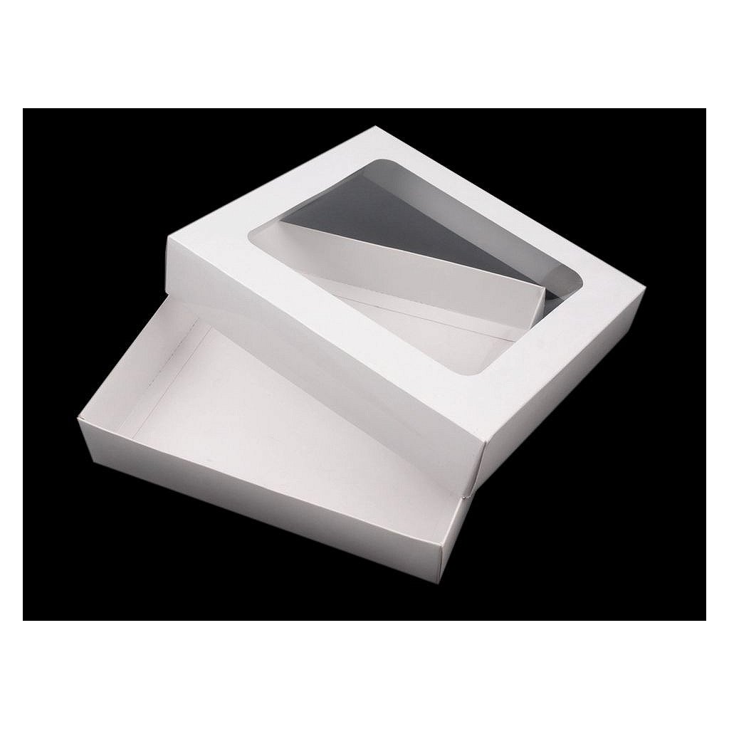 Krabice vhodná na dárkové balení má výřez ve víku z průhledné fólie. Využijete ji na balení dárků, uložení baněk apod. Můžete si ji i dozdobit podle svého vkusu.