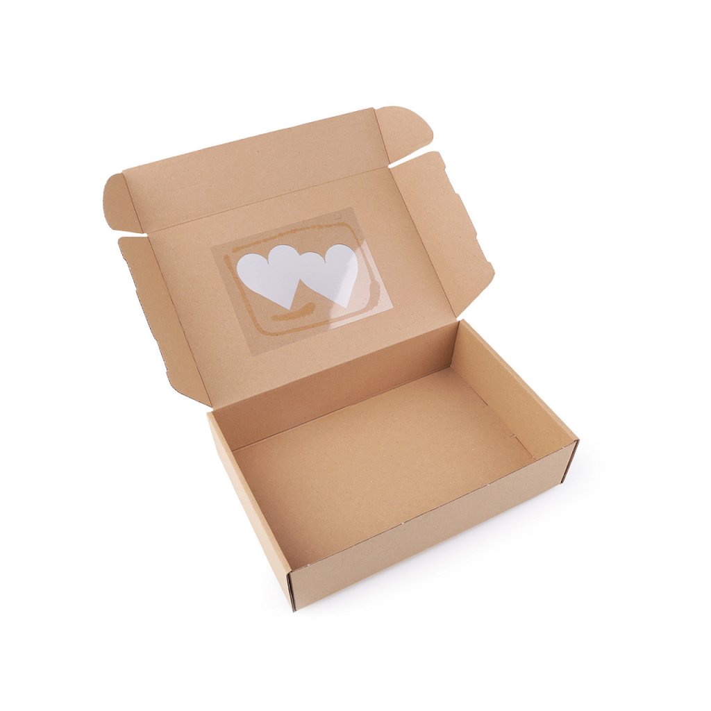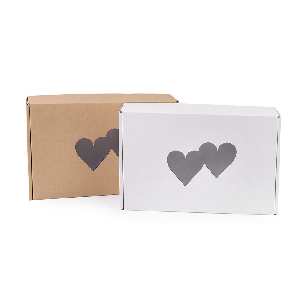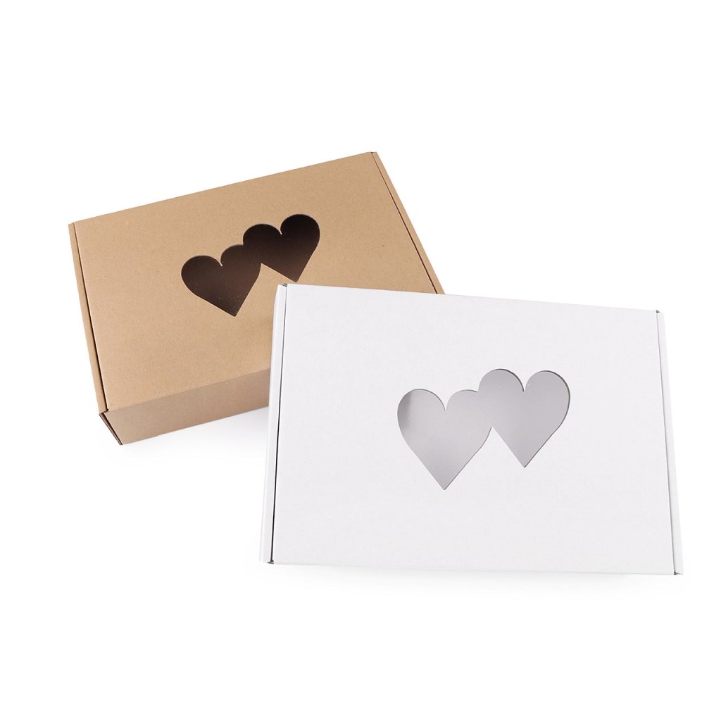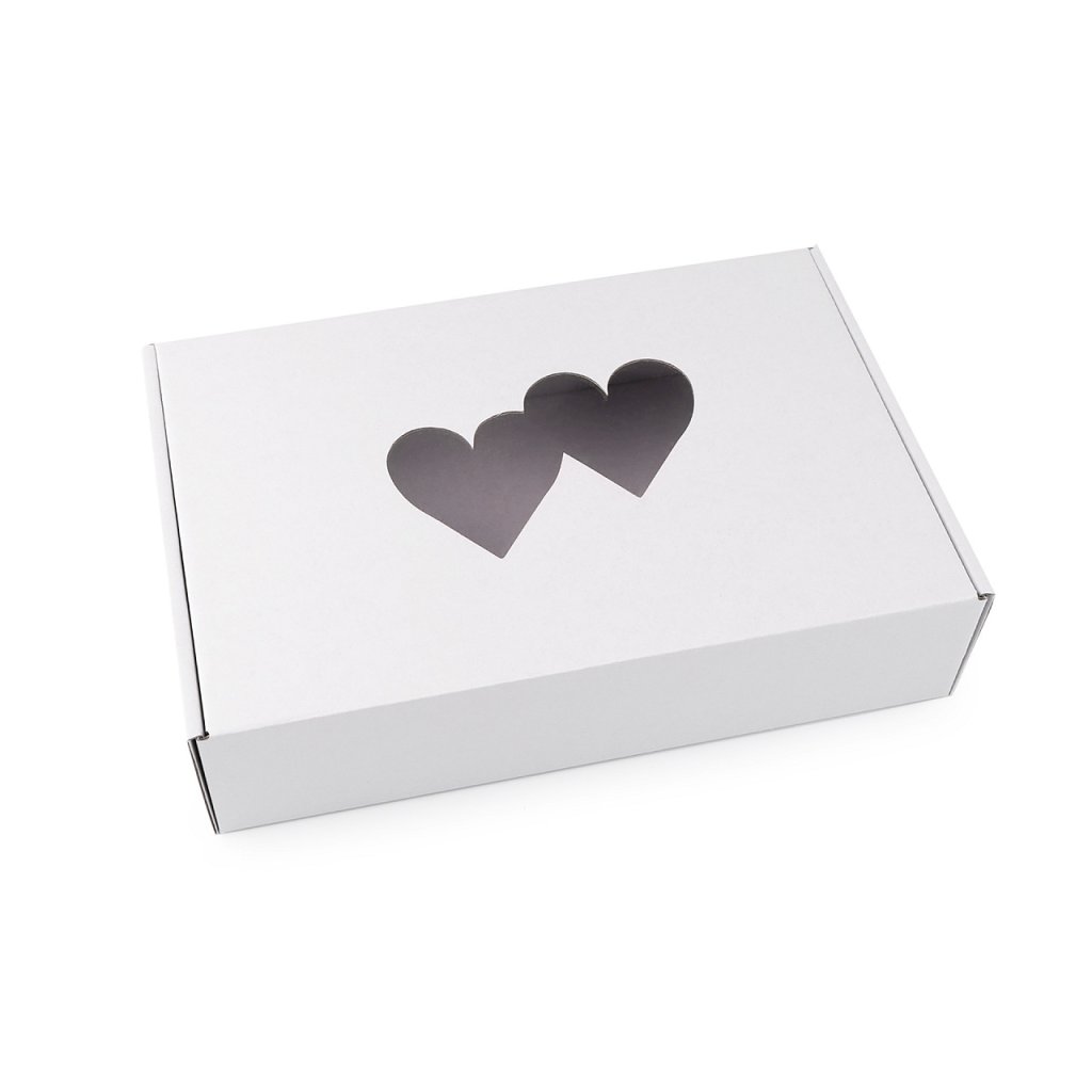 Papírová krabice má ve víku výřez ve tvaru dvou srdcí. Výřez je zespodu podlepený průhlednou fólií. Krabici využijete na balení dárků, šátků, svatební výslužky apod. Můžete si ji i dozdobit podle svého vkusu.