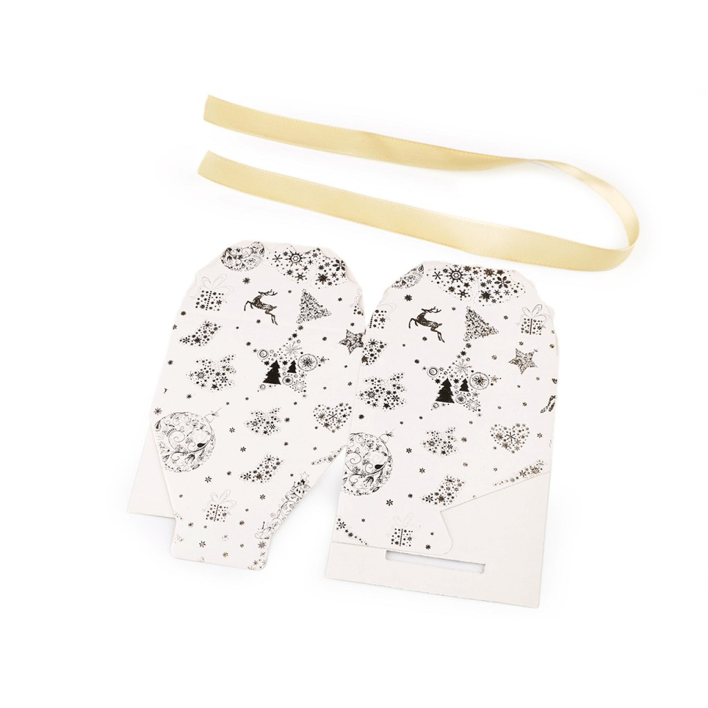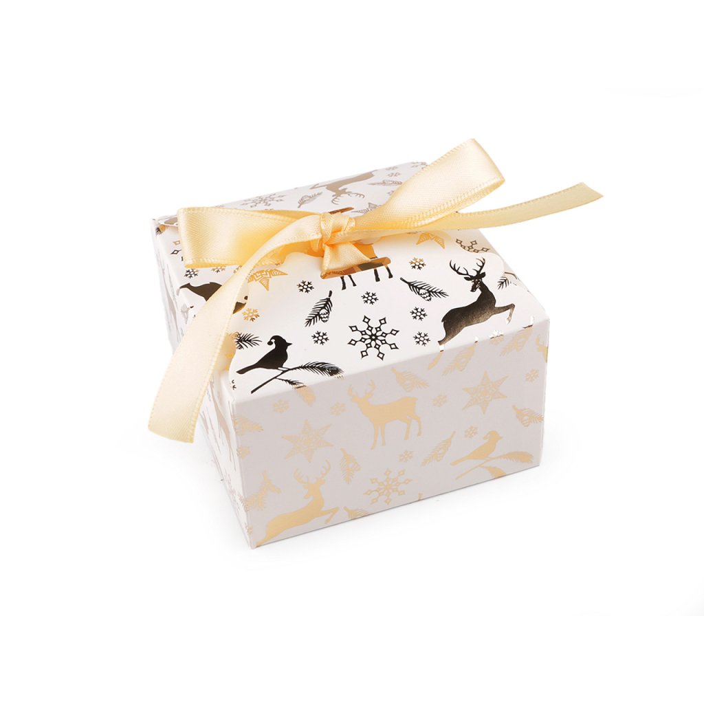 Elegantní krabička s vánočními motivy je vhodná na zabalení menších dárků (šperků, pralinek, ponožek apod.). Motivy jsou metalické. Součástí balení je saténová stuha.