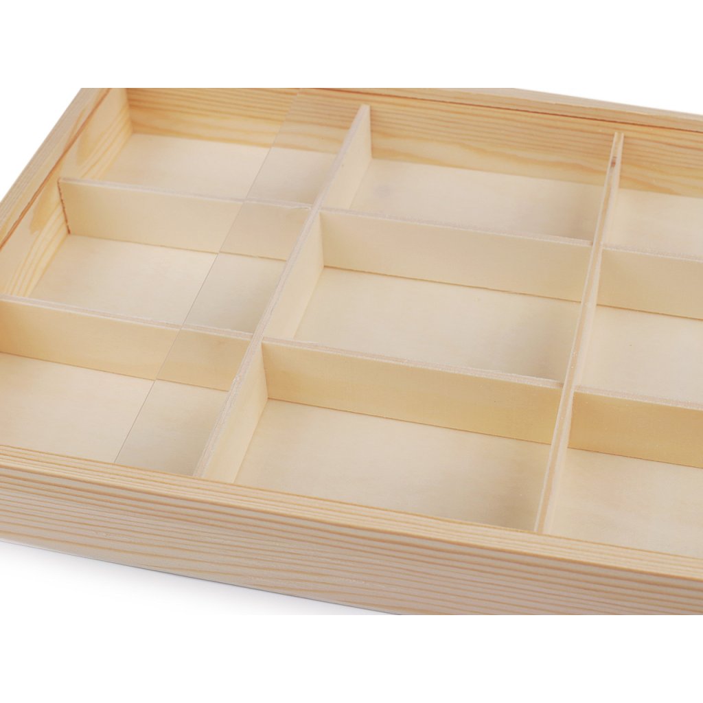 Dřevěná krabička se zasouvacím průhledným víkem se hodí na uložení drobného materiálu na vaše kreativní tvoření. Hodí se na korálky, knoflíky, bižuterní materiál apod. Najde využití i jako organizér v domácnosti, do skříně, šuplíku apod. Vejdou se do ní náramky, gumičky, sponky apod. Je oblíbená i sběrateli drahých kamenů a minerálů.