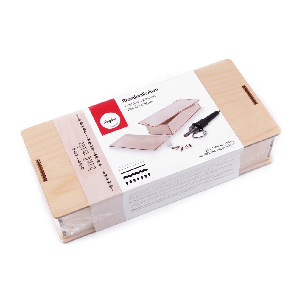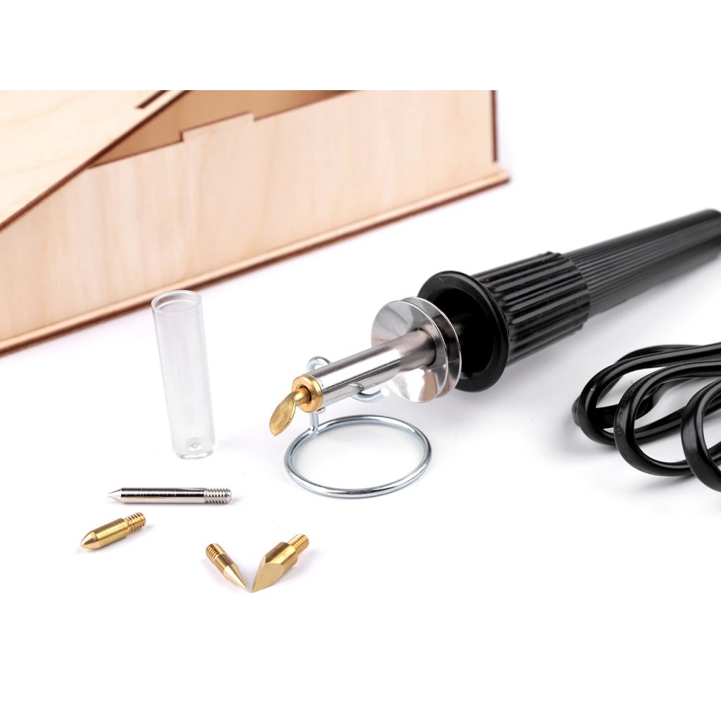 Sada obsahuje: vypalovací pero, stojánek, 5 různých hrotů, krabičku a návod.