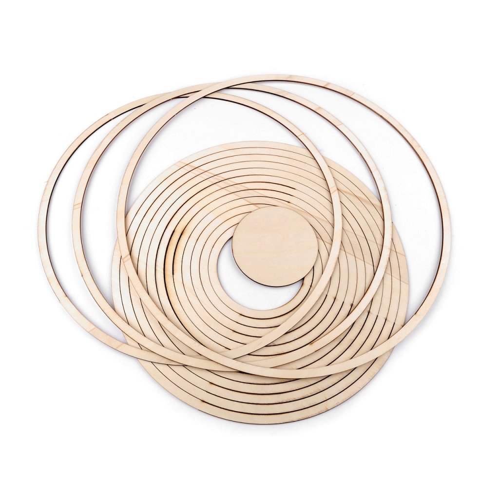 Sada dřevěných kruhů s různými průměry je vynikající na výrobu lapačů snů. Hodí se na obháčkování, macramé, drátování, na výrobu bytových dekorací, stromů života apod. Kruhy jsou přírodní, nelakované. Mají vnější průměr 12, 14, 16, 18, 20, 22, 24, 26, 28, 30, 32, 34, 36, 38, 40 cm. Jsou široké 1 cm.