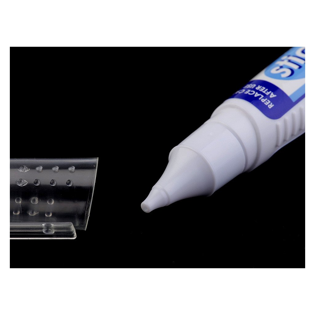 Špičku nestříhejte! Otevřete uzávěr a odlepte jisticí fólii. Poté uzávěr opět zašroubujte. Naneste špičkou tenkou vrstvu lepidla a lepený předmět hned přiložte. Po použití lepidlo zavřete víčkem, aby nevysychalo. Pokud lepidlo ve špičce zaschne, propíchněte špičku špendlíkem.