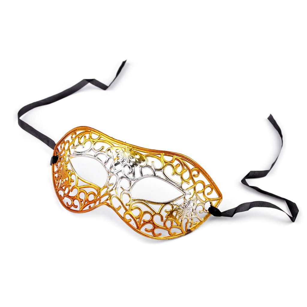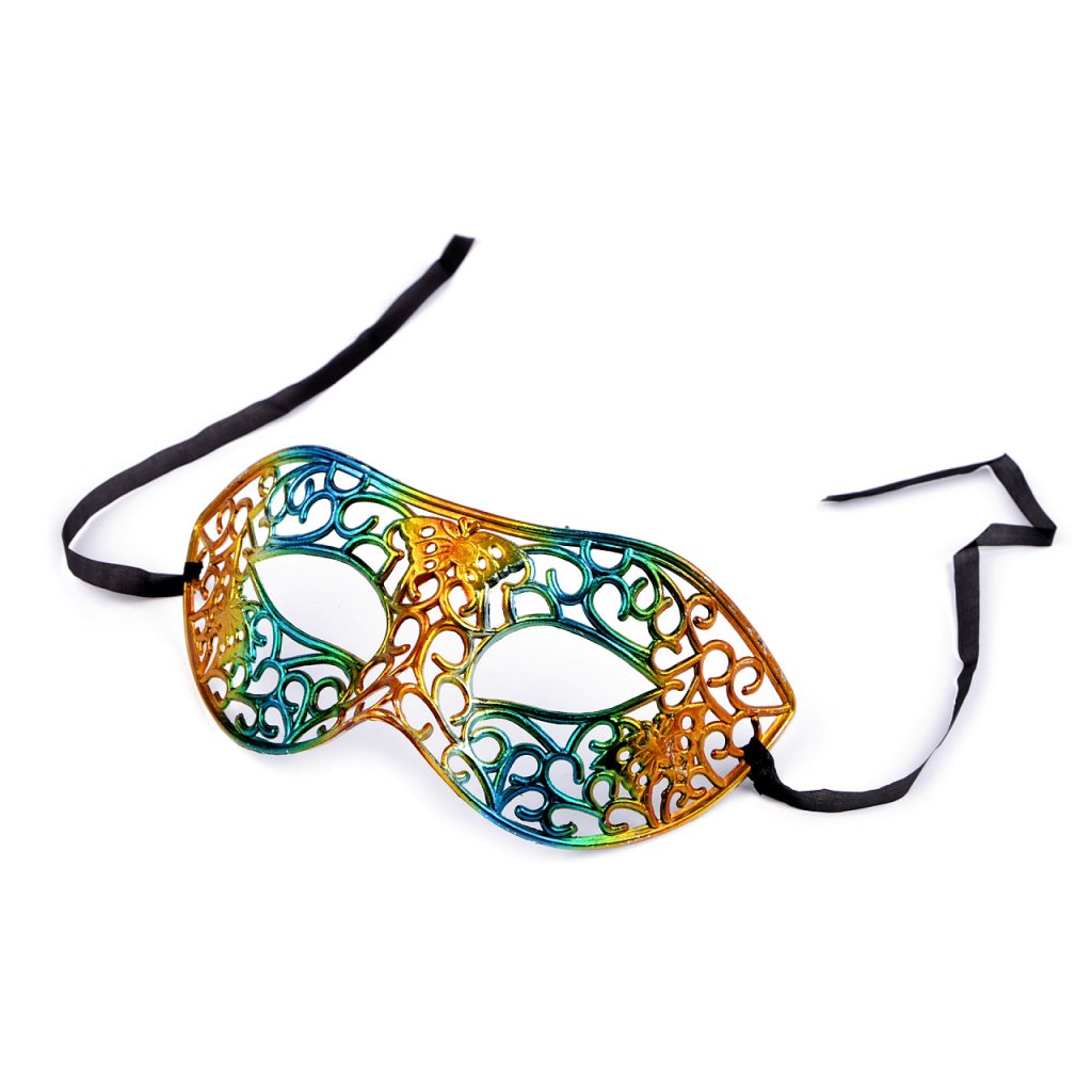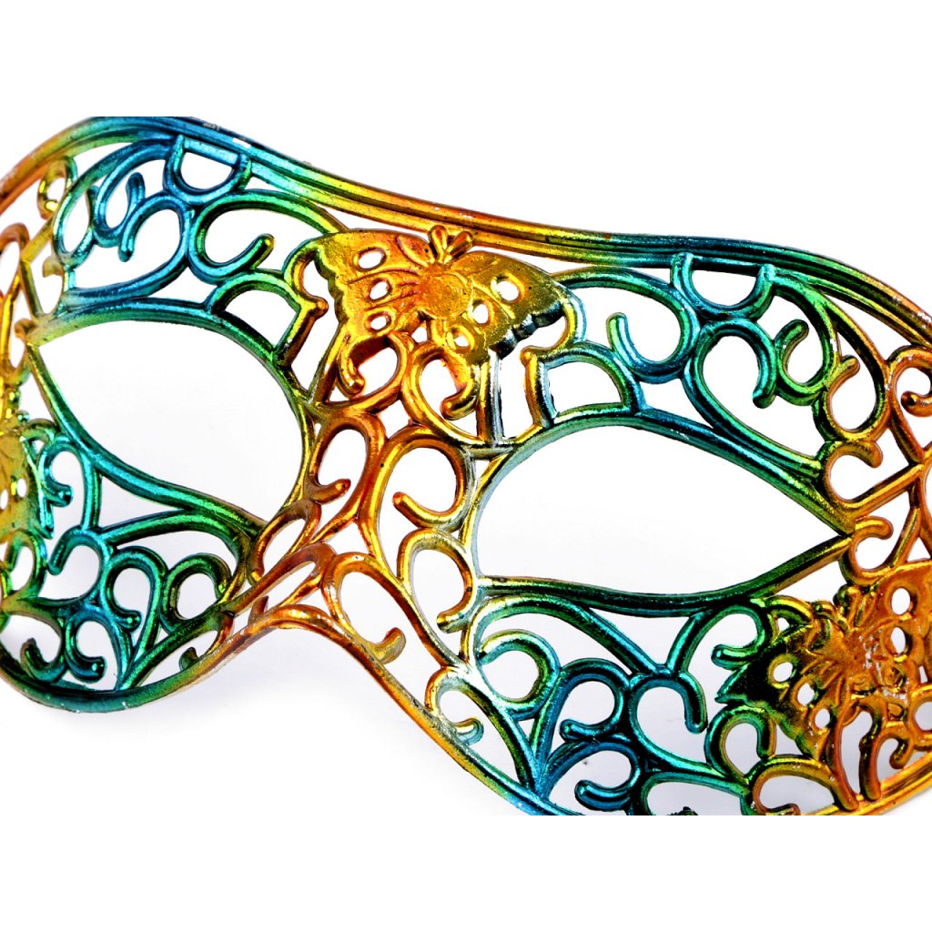 Efektní škrabošku využijete jako doplněk na karnevaly, párty, večírky nebo plesy. Zdobí ji zajímavé barevné přechody v metalických barvách. Je vyrobená z pevného plastu, který dobře drží tvar. Uvazuje se pomocí stuhy.