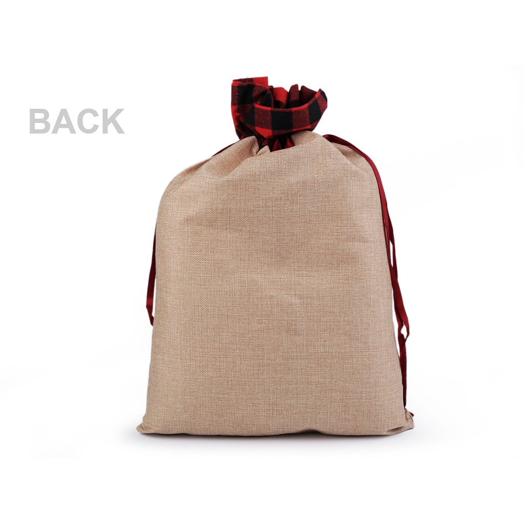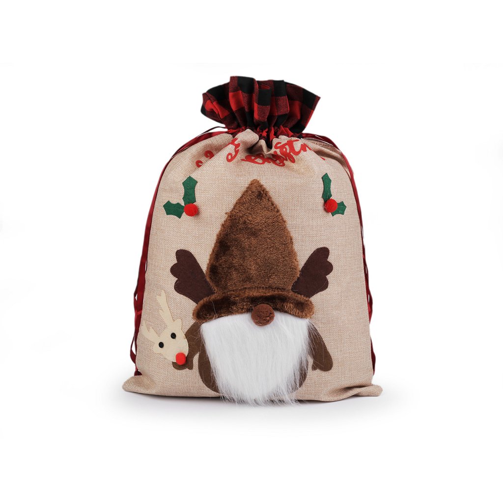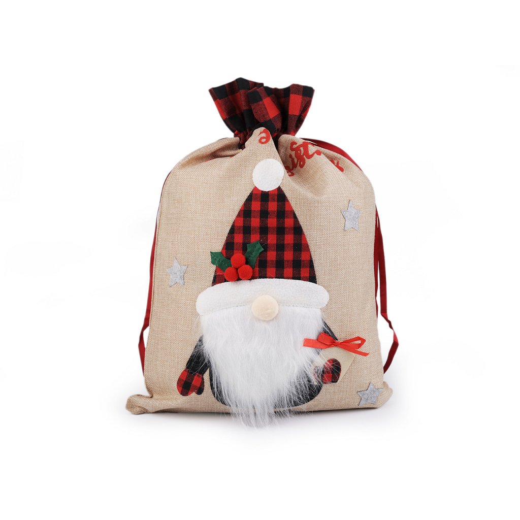 Vánoční pytel si získá srdce všech dětí. Je vyrobený z imitace juty, na přední straně jej zdobí aplikace postavy se spoustou zajímavých detailů. Nahoře je ozdobený károvaným lemem. Hodí se nejen na zabalení dárků, ale i jako poutavá dekorace na Vánoce. Pohodlně se uzavírá pomocí saténových stahovacích šňůrek.