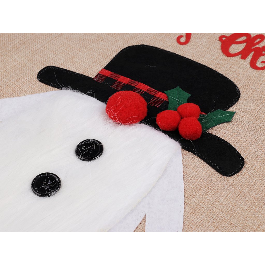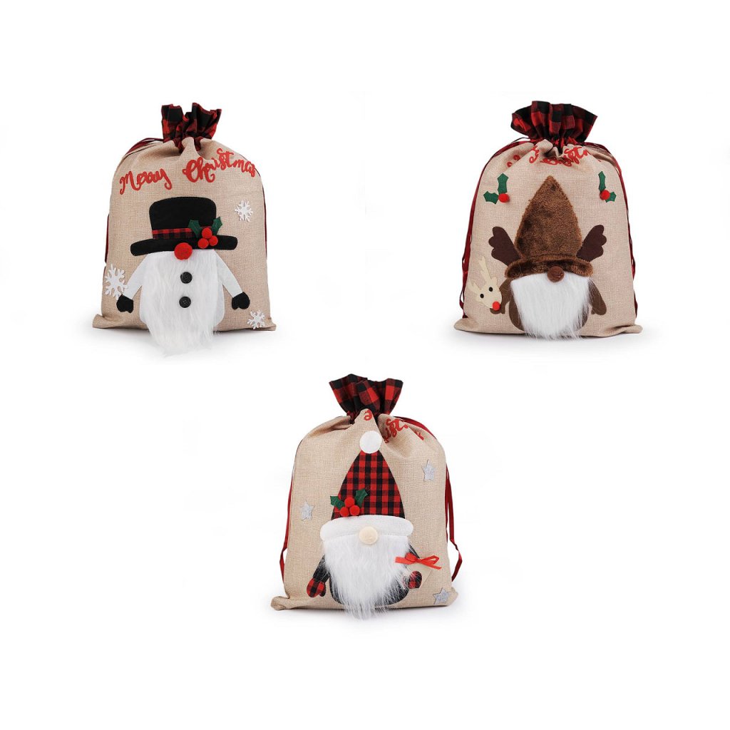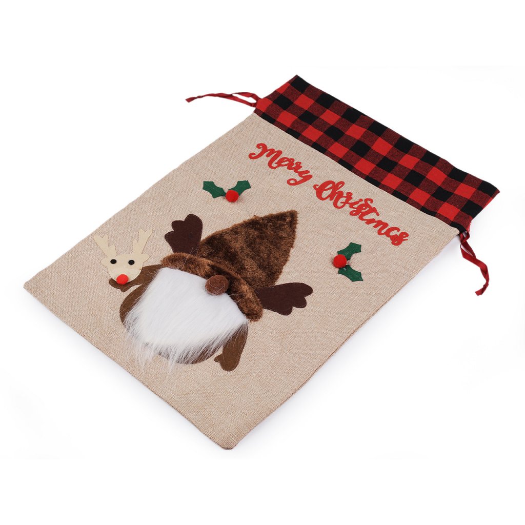 Vánoční pytel si získá srdce všech dětí. Je vyrobený z imitace juty, na přední straně jej zdobí aplikace postavy se spoustou zajímavých detailů. Nahoře je ozdobený károvaným lemem. Hodí se nejen na zabalení dárků, ale i jako poutavá dekorace na Vánoce. Pohodlně se uzavírá pomocí saténových stahovacích šňůrek.