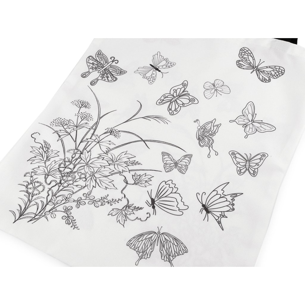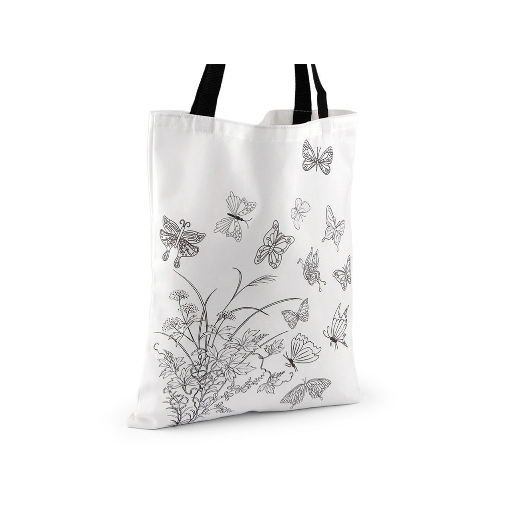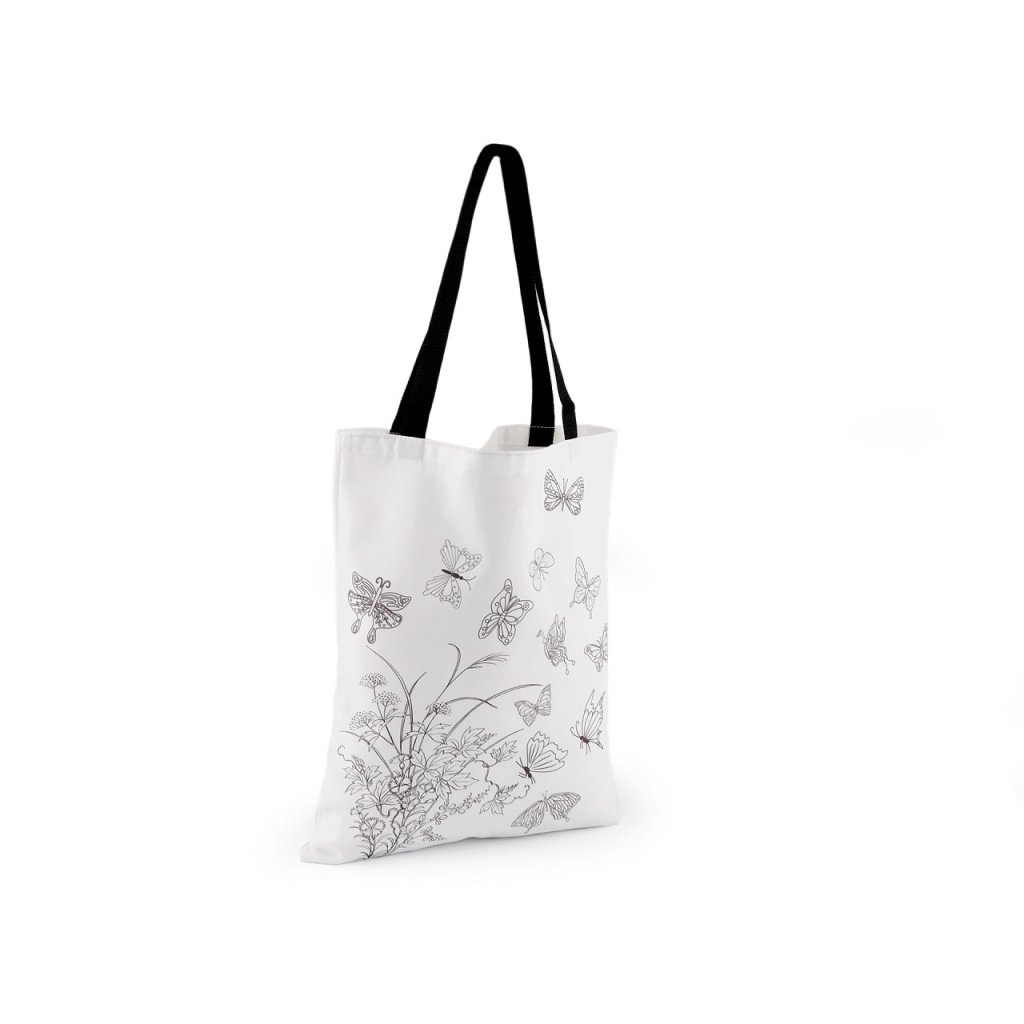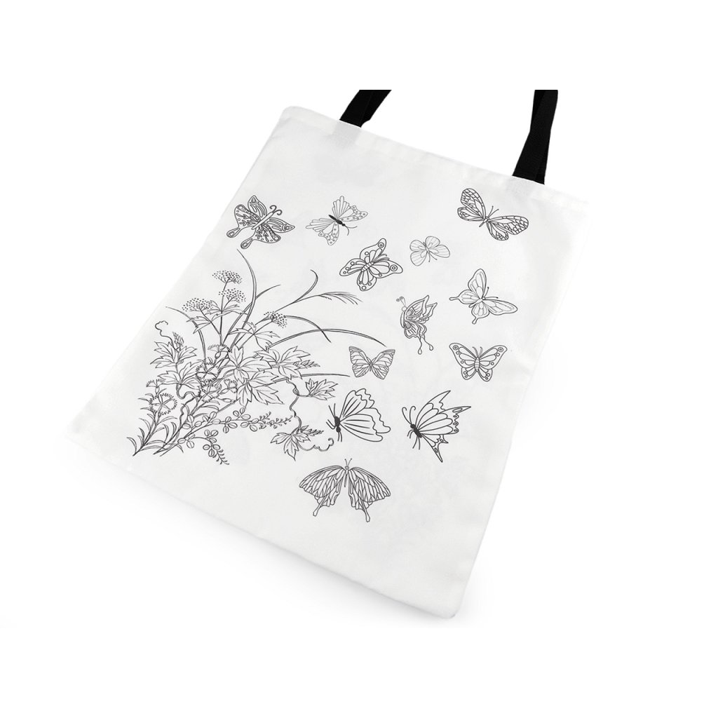 Textilní taška má z obou stran potisk s obrázkem květů a motýlů. Je velice kvalitní, pevná, hodí se na běžné nošení i nákupy. Má dlouhá ucha z pevných popruhů, dají se nosit v ruce i přes rameno.