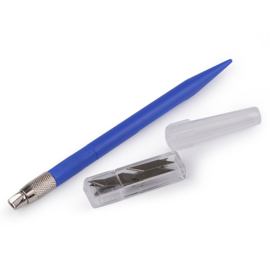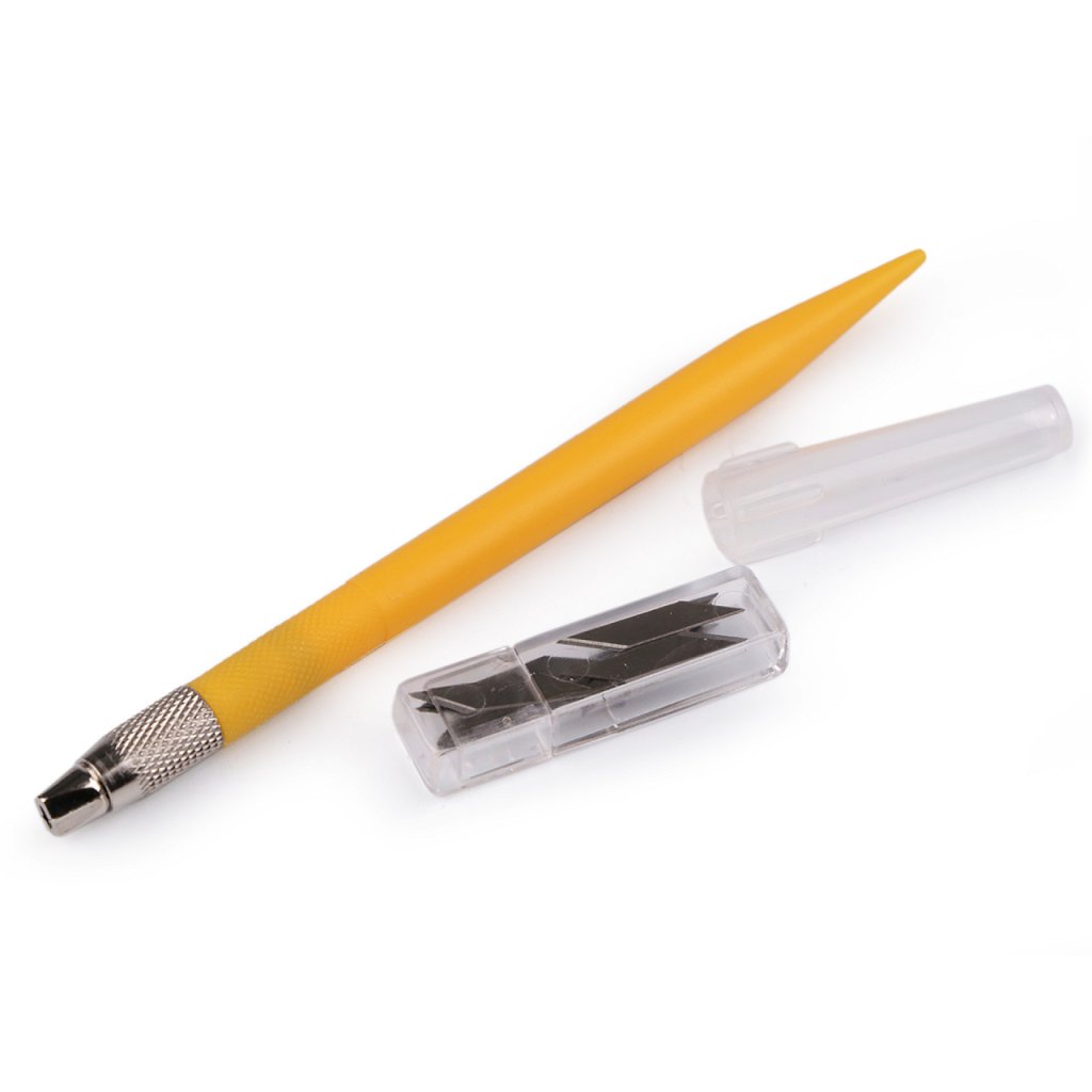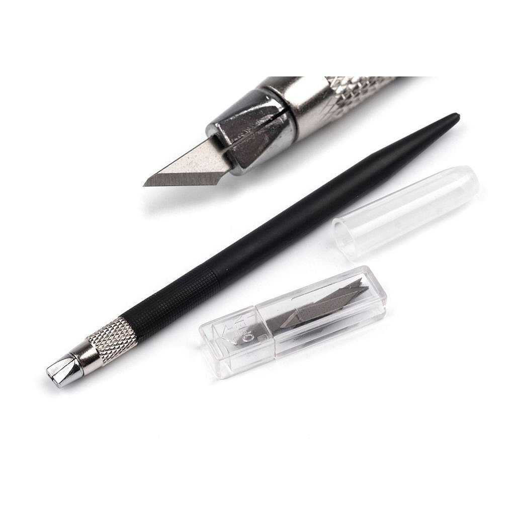 Sada obsahuje: 12 vyměnitelných čepelí 4 x 22 mm, s délkou ostří 7 mm, plastový tužkový držák o průměru 0,9 cm, dlouhý 14 cm a kovové šroubovací pouzdro na uchycení čepele.