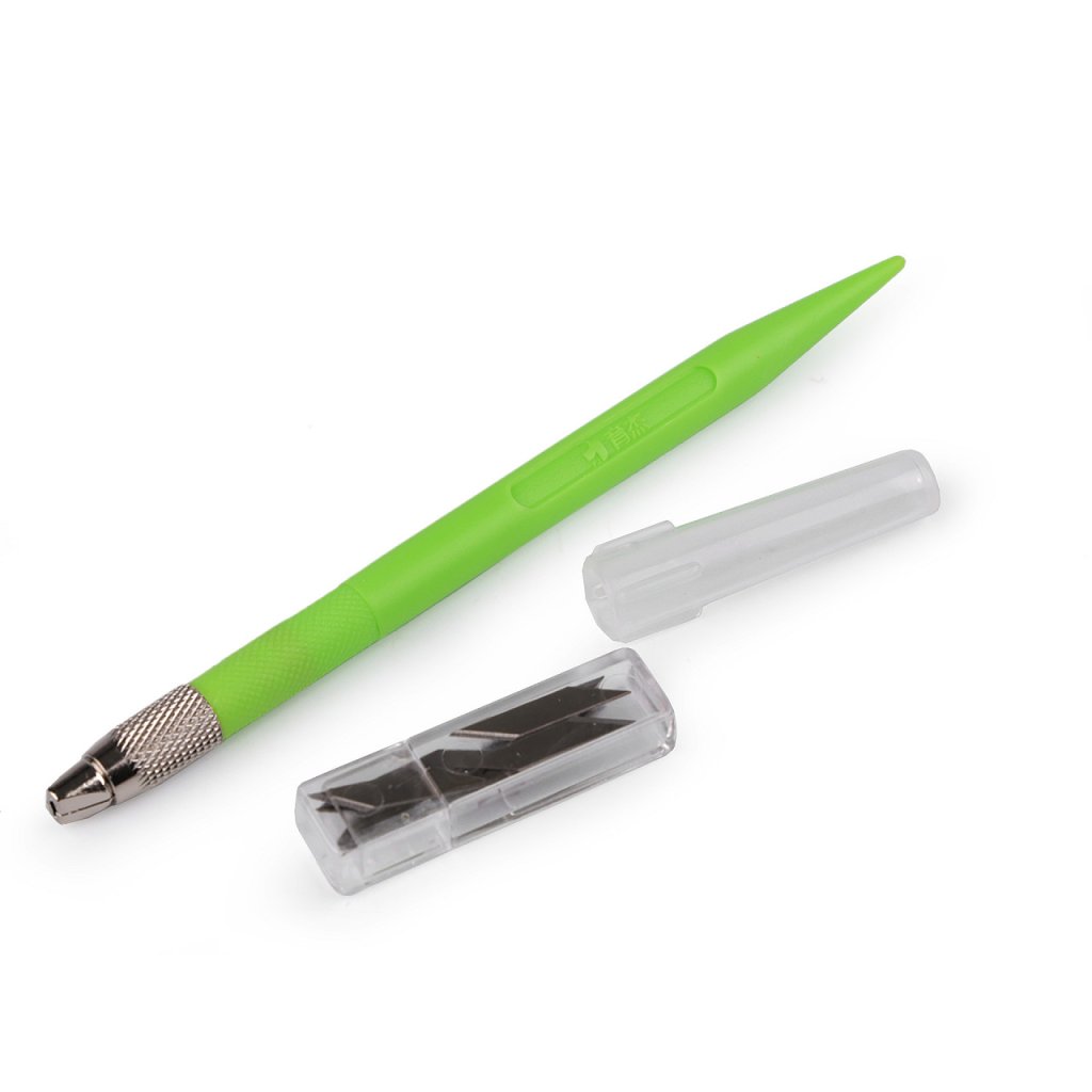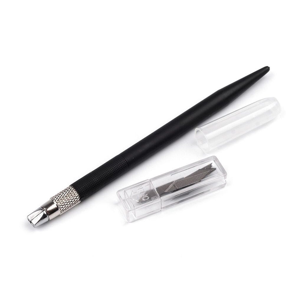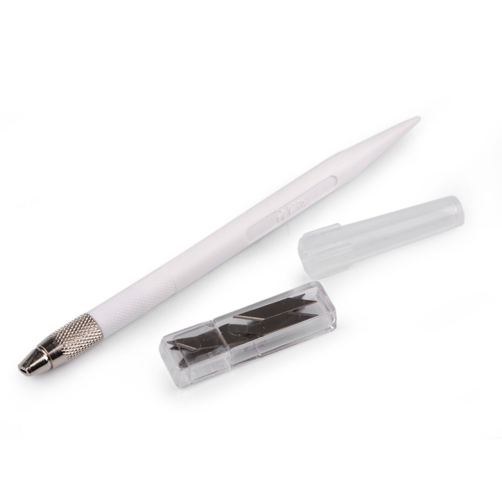 Sada obsahuje: 12 vyměnitelných čepelí 4 x 22 mm, s délkou ostří 7 mm, plastový tužkový držák o průměru 0,9 cm, dlouhý 14 cm a kovové šroubovací pouzdro na uchycení čepele.