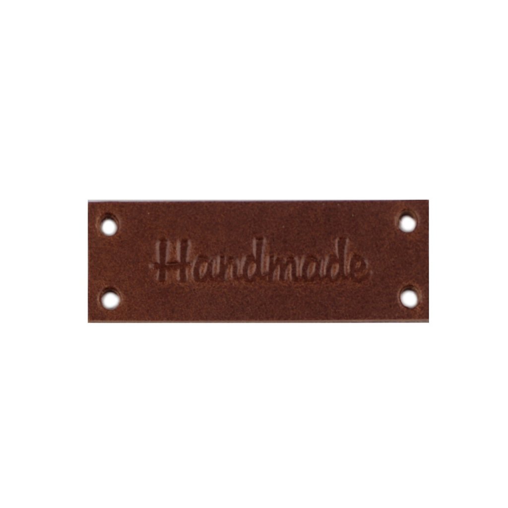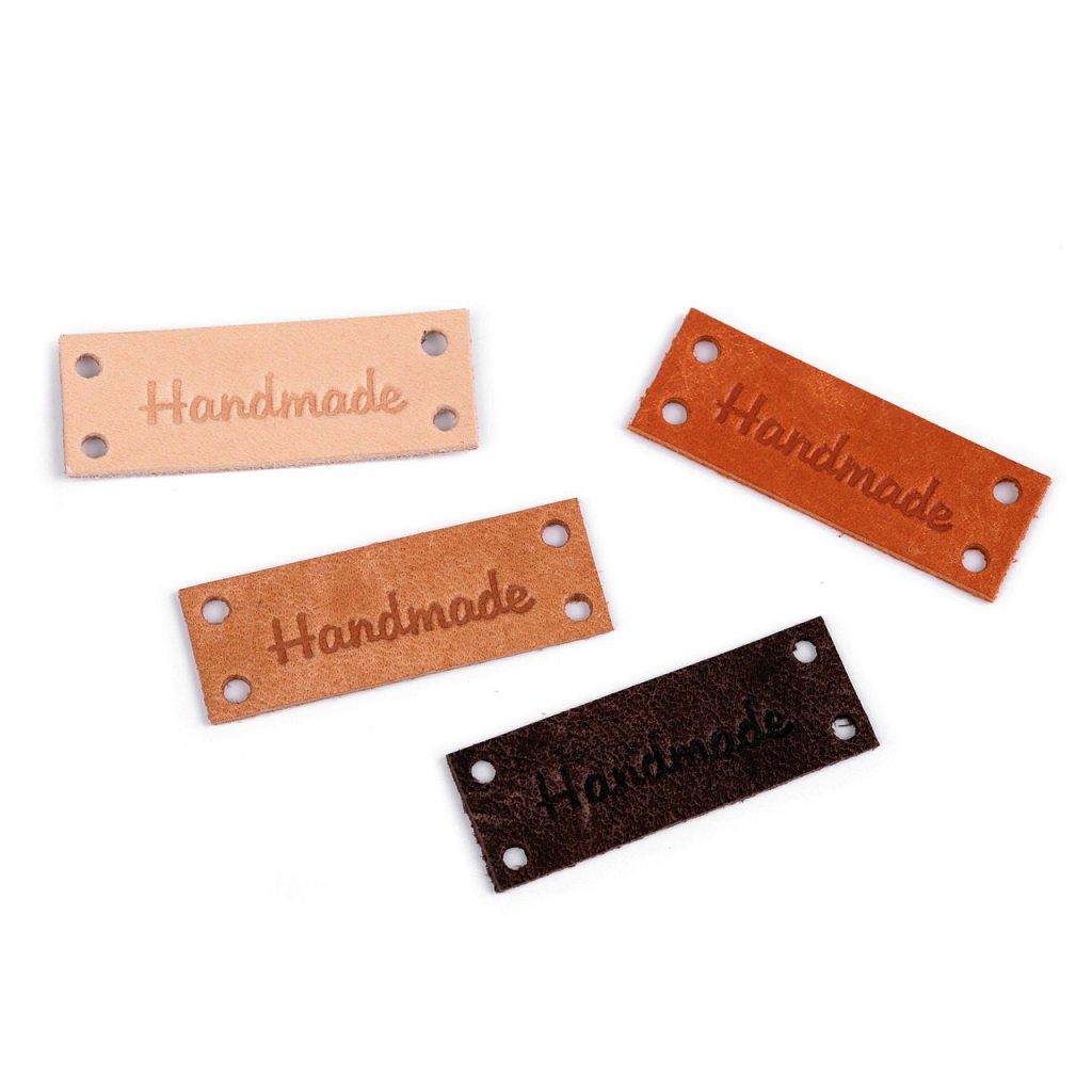 Kožená cedulka je jednostranná, na bocích má otvory k přišití. Zdobí ji vyražený nápis Hand made.