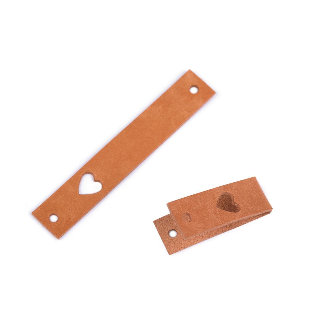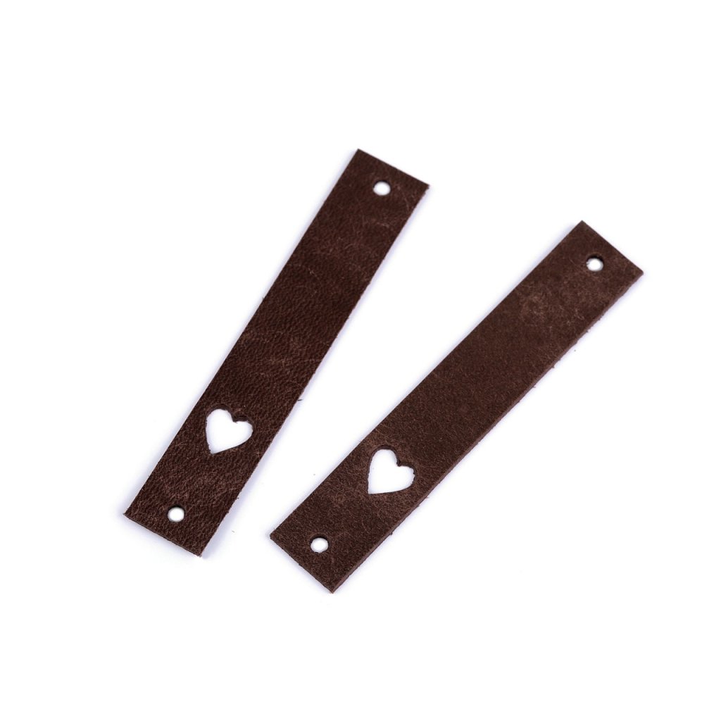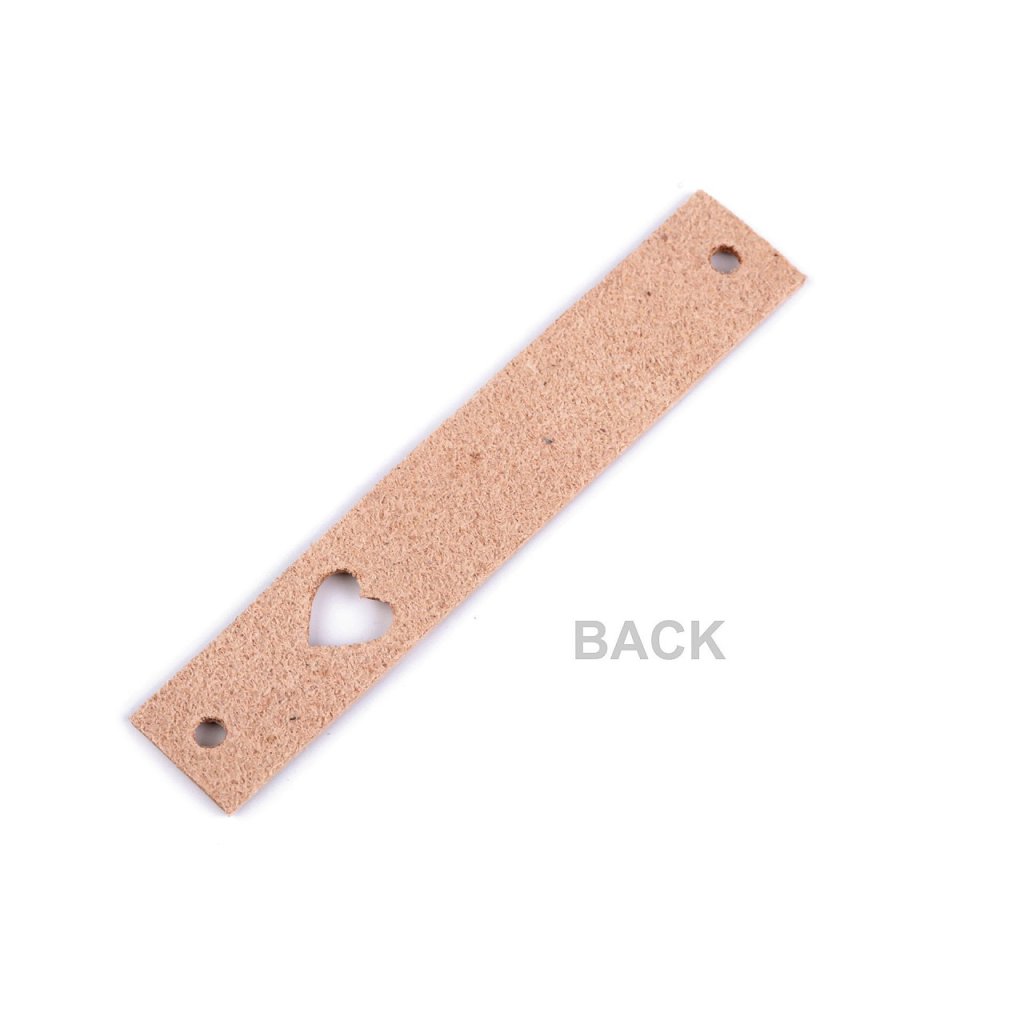 Kožená cedulka je jednostranná, na bocích má otvory k přišití. Zdobí ji vyražený otvor srdíčka.