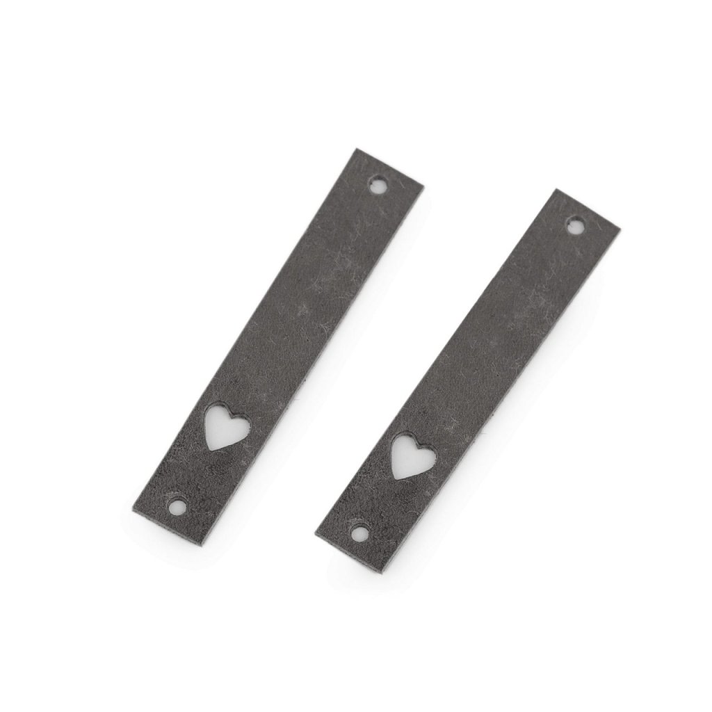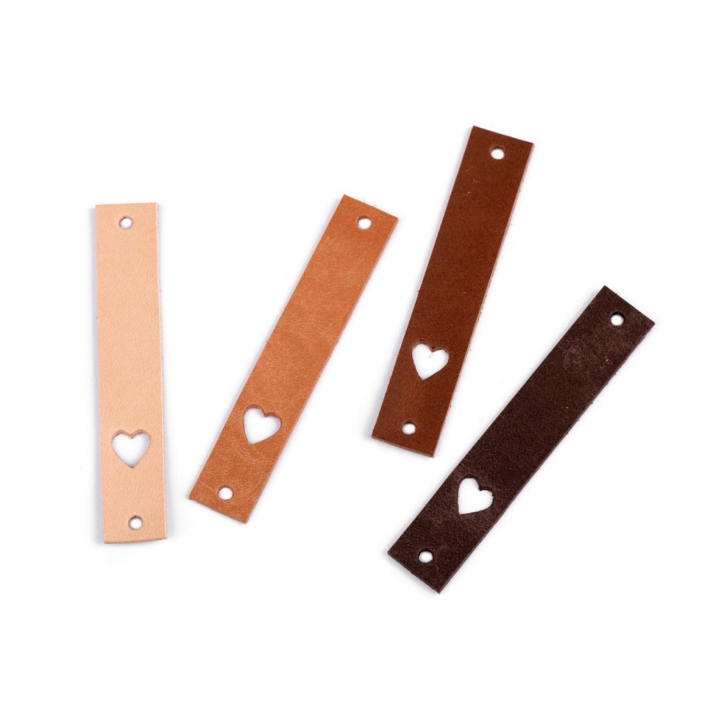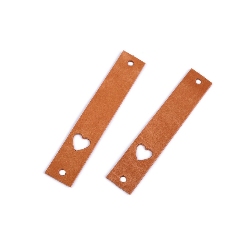 Kožená cedulka je jednostranná, na bocích má otvory k přišití. Zdobí ji vyražený otvor srdíčka.