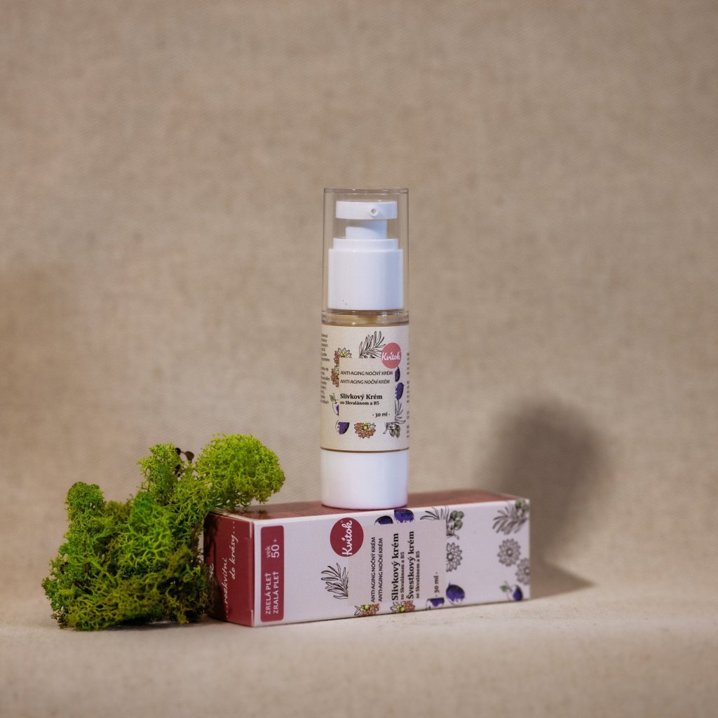 Pokožka po padesátce začíná ztrácet elasticitu a může ji trápit suchost či pigmentové skvrny. Krom zdravého životního stylu, pobytu na čerstvém vzduchu a dostatečného spánku, je třeba jí poskytnout kvalitní a adekvátní péči. V Kvitku namíchali tento báječný 100% přírodní švestkový krém, který je bohatý na antioxidanty a rostlinný kolagen.. Složení krému je obohacené o olivový skvalan a provitamín B5, které napomáhají obnově přirozeného ochranného filmu a zabraňují dehydrataci vaší pokožky.. Pro kompletní péči o vaši pleť jej doporučujeme kombinovat s denním krémem ze stejné řady.