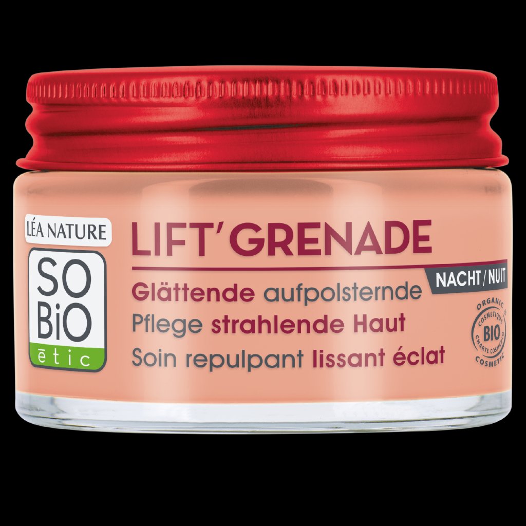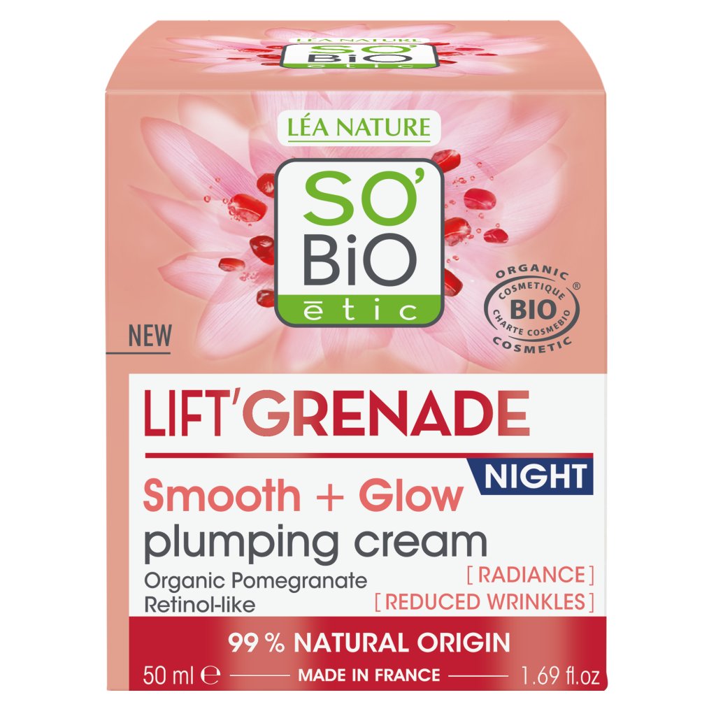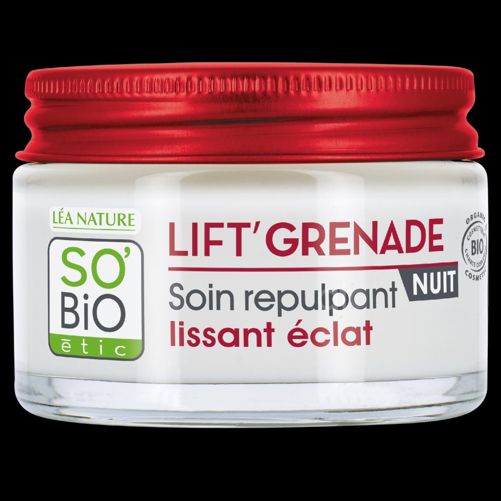 SO’BiO étic Lift'Grenade BIO je rozjasňující noční krém, který pomáhá redukovat viditelnost vrásek díky unikátní kombinaci přírodních látek. Složení obsahuje bio extrakt z granátového jablka s antioxidačními účinky a retinolu podobný výtažek z mořského fenyklu, jenž účinně napomáhá vyhlazovat a oživovat pleť. Krém s 99 % přírodních složek, bez silikonů a s certifikací Ecocert Cosmos Organic, jemně pečuje o pokožku přes noc. Nanáší se večer na obličej a krk, ráno působí pokožka jasněji a vypnutěji.