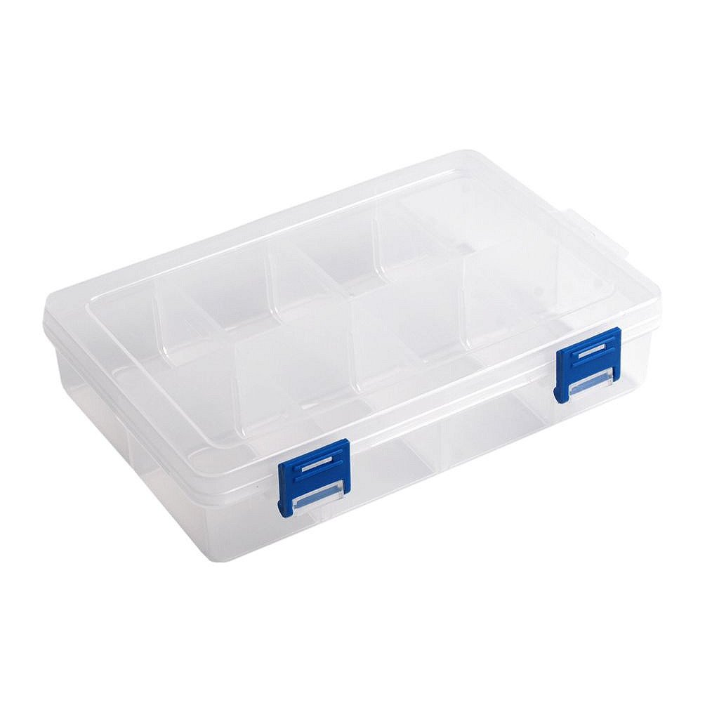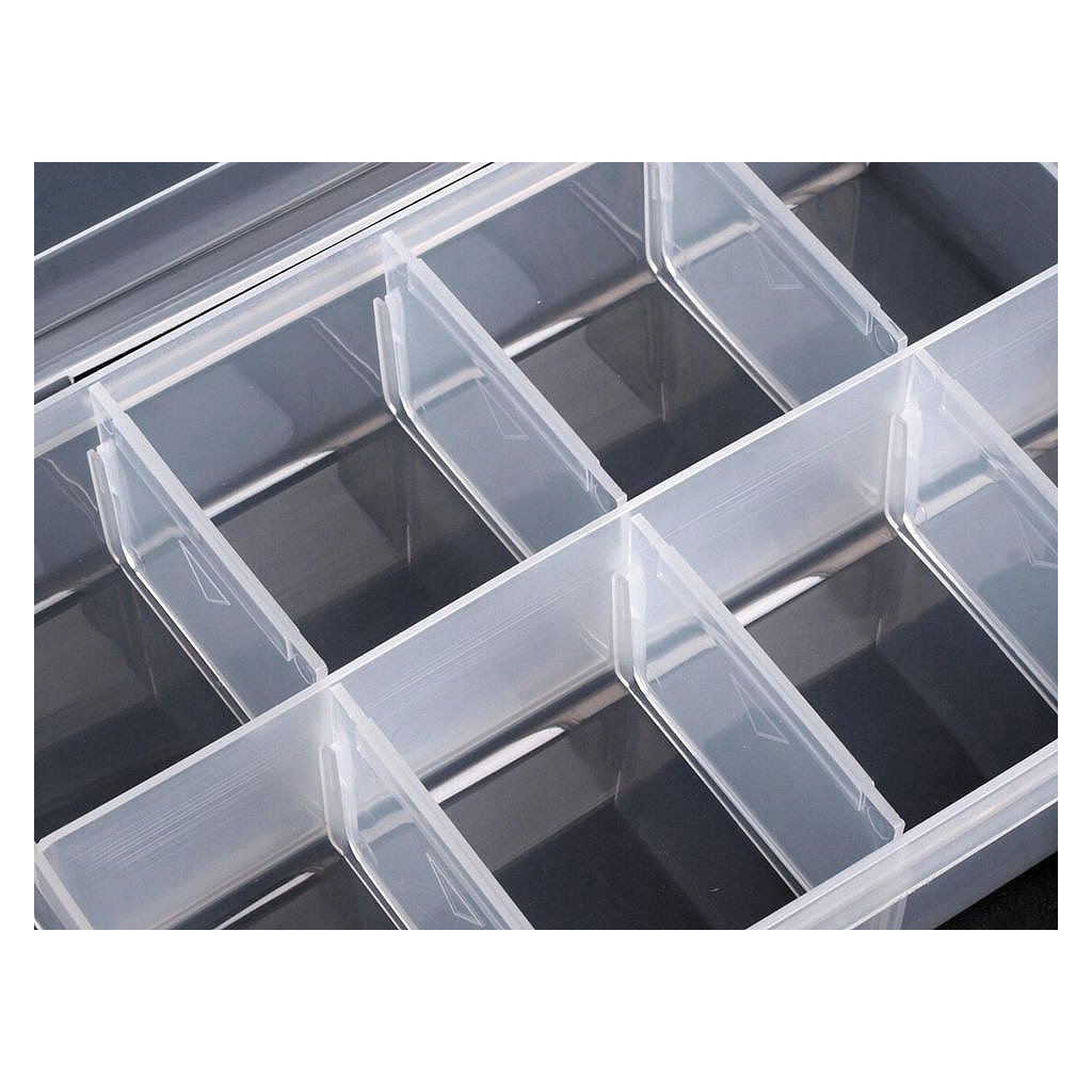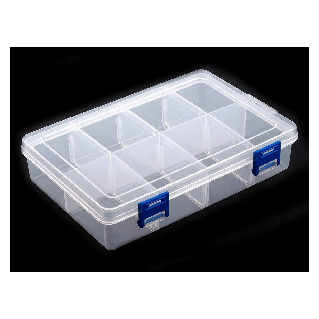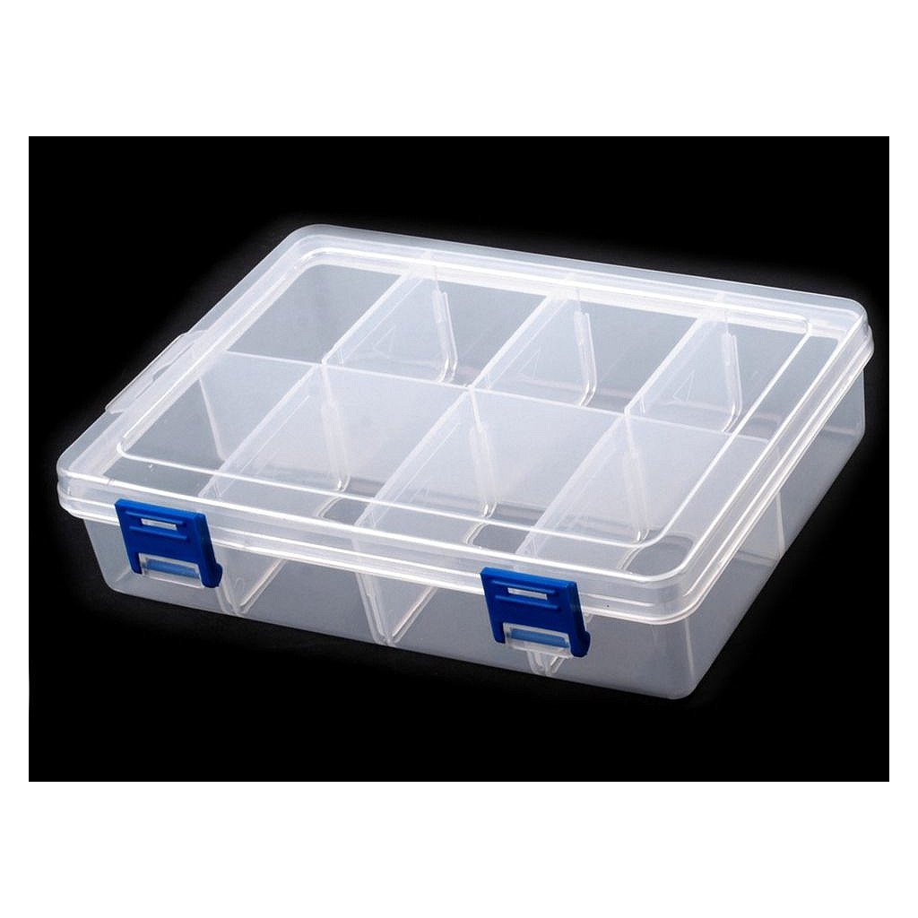 Krabička má 8 přihrádek o velikosti 4 x 4,4 x 6,3 cm. Přihrádky si můžete regulovat pomocí odstranitelných přepážek ( 8 x krátké jednotlivé), pokud odstraníte všechny, budete mít 2 prostory o velikosti 6 x 19 cm.