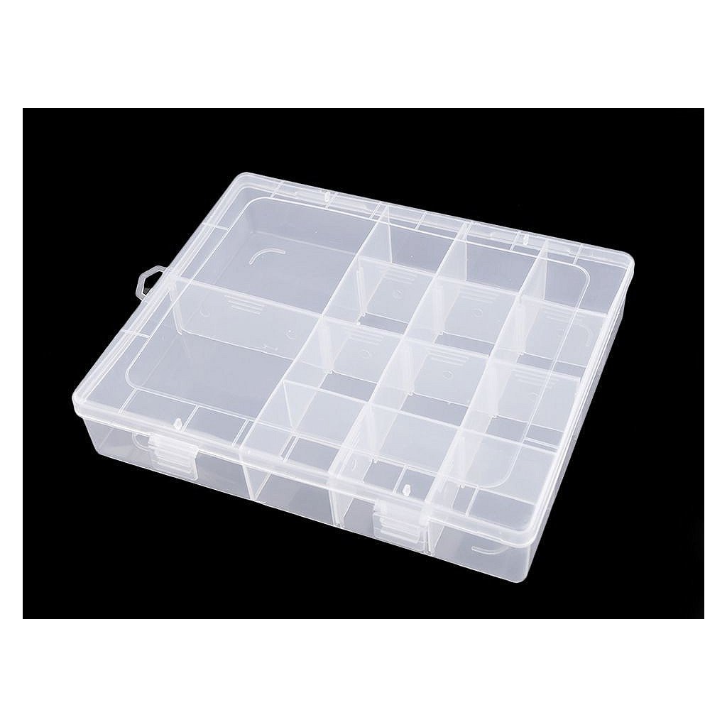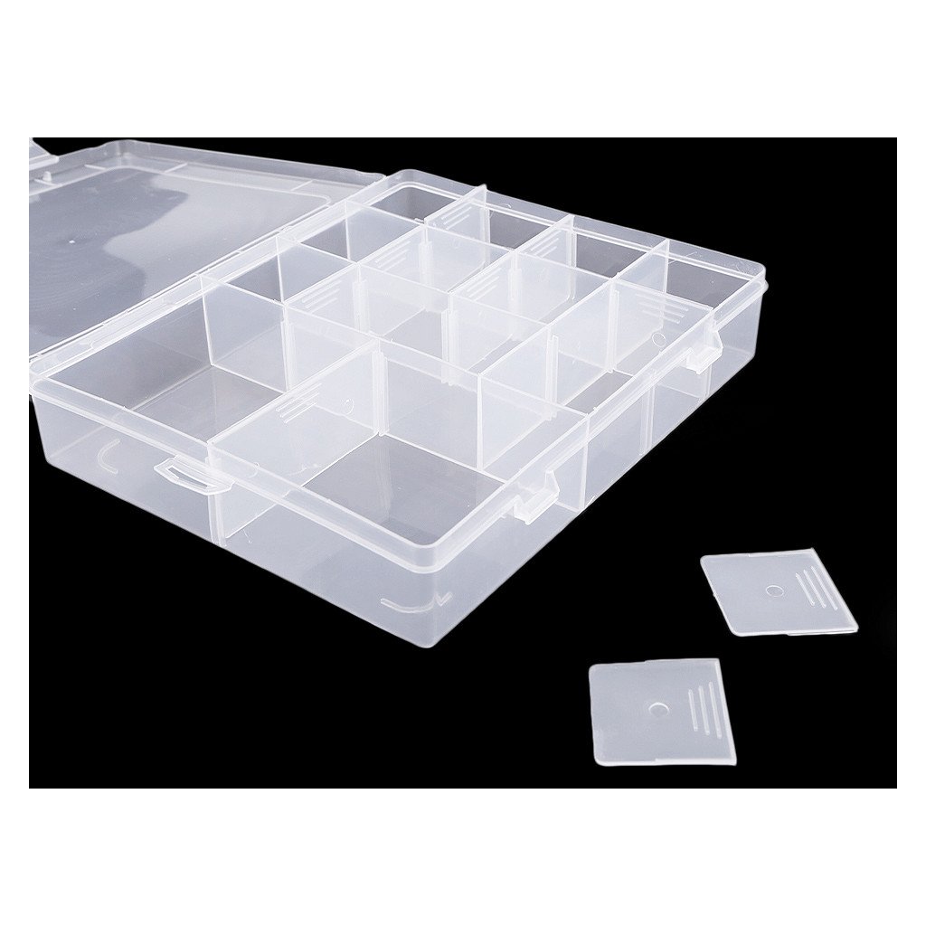 Má 12 malých přihrádek o velikosti 4 x 4 x 3,5 cm a 2 větší přihrádky o velikosti 8 x 8 x 3,5 cm. Přihrádky si můžete regulovat pomocí odstranitelných přepážek. Krabička je uzavíratelná.