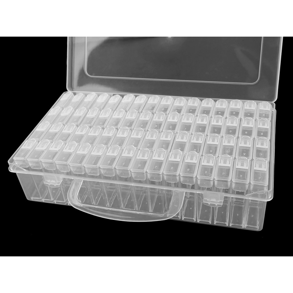 Plastový box s 64 krabičkami využijí všichni, kteří potřebují uložit a roztřídit velké množství drobného materiálu, jako jsou korálky, flitry, glitry, hot-fixy apod. Krabičky mají nahoře praktický otevírací uzávěr na zacvaknutí označený písmenkem. Díky transparentního materiálu je do nich dobře vidět. Box vypadá jako kufřík, má ucho na přenášení, je uzavíratelný.