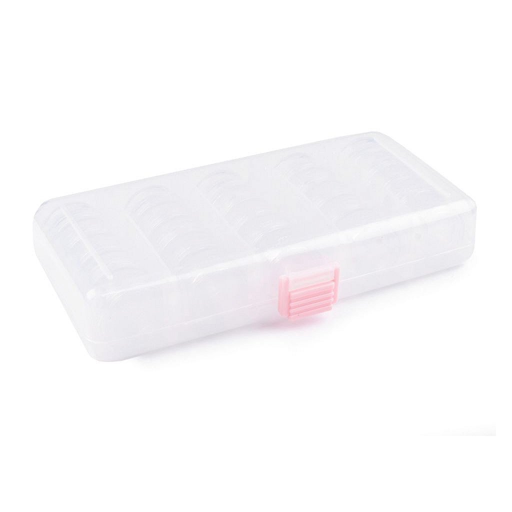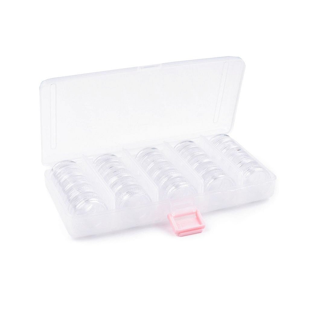 Box s plastovými dózičkami využijete na uložení a přenášení drobného materiálu, jako jsou korálky, flitry, glitry, hot-fixy apod. V boxu je v jednom sloupci 5 plastových šroubovacích dóz, které se šroubují na sebe, horní je vždy ukončená víčkem. Celkem je tedy v boxu 25 ks těchto velmi praktických dóziček a 5 horních víček.