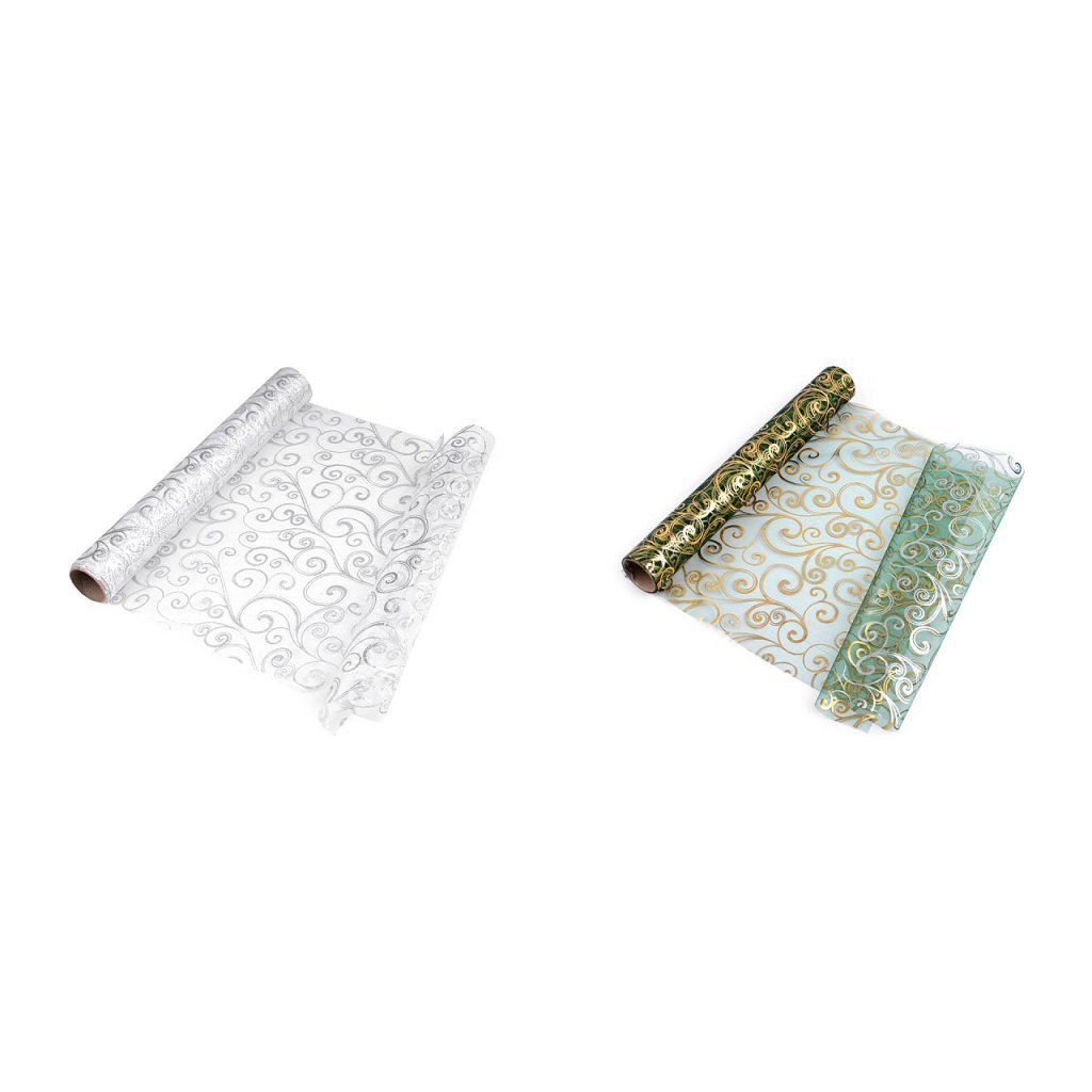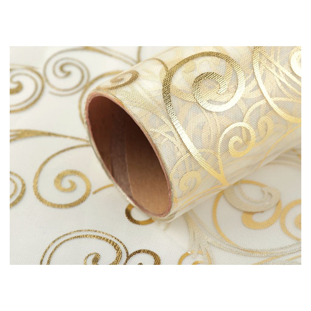 Dekorační organza je ozdobena metalickým potiskem ornamentů, které ji dodávají nádech luxusu.