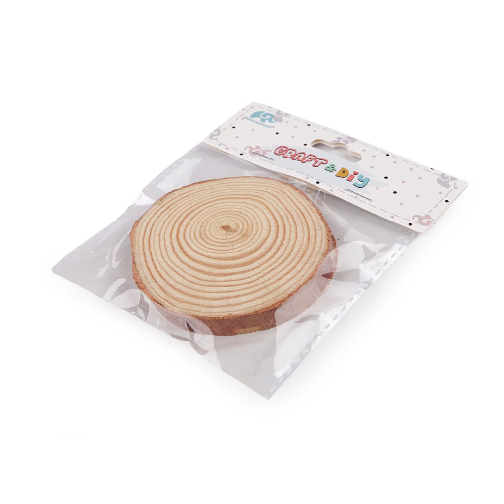 Dřevěné přírodní kolečko se hodí k dalšímu dotvoření. Je z obou stran rovné, po obvodu má kůru. Není barvené ani lakované, každý kus se může lišit jak barvou, tak kresbou dřeva, velikostí i tloušťkou.