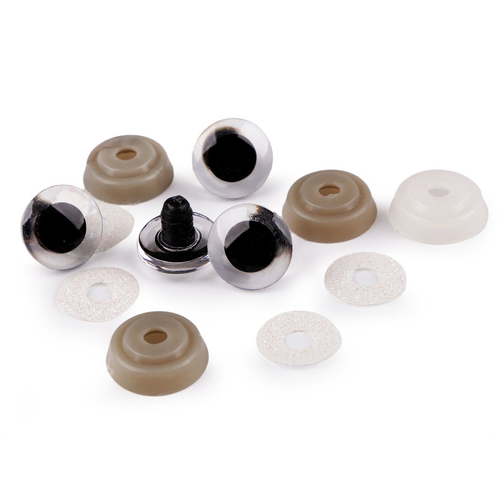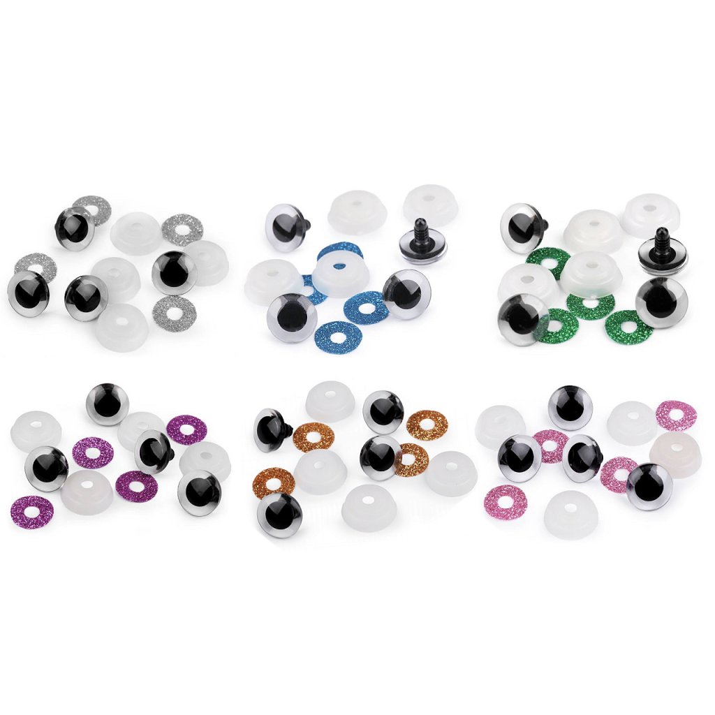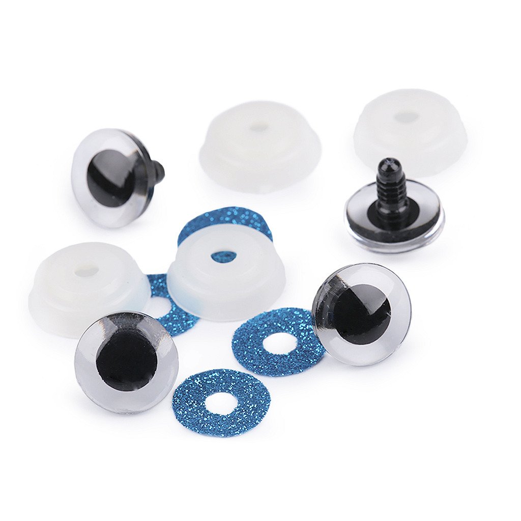Polokulaté oči se třpytivou duhovkou umocní výraz vašich nejrůznějších postaviček či zvířátek. Mají závit, na který se nasadí duhovka, následně se provleče materiálem, a z druhé strany se pak nacvakne pojistka, která oči bezpečně připevní na místo. Pokud nebudete chtít, aby se oči třpytily, nemusíte duhovku použít, v tom případě zůstane duhovka transparentní.