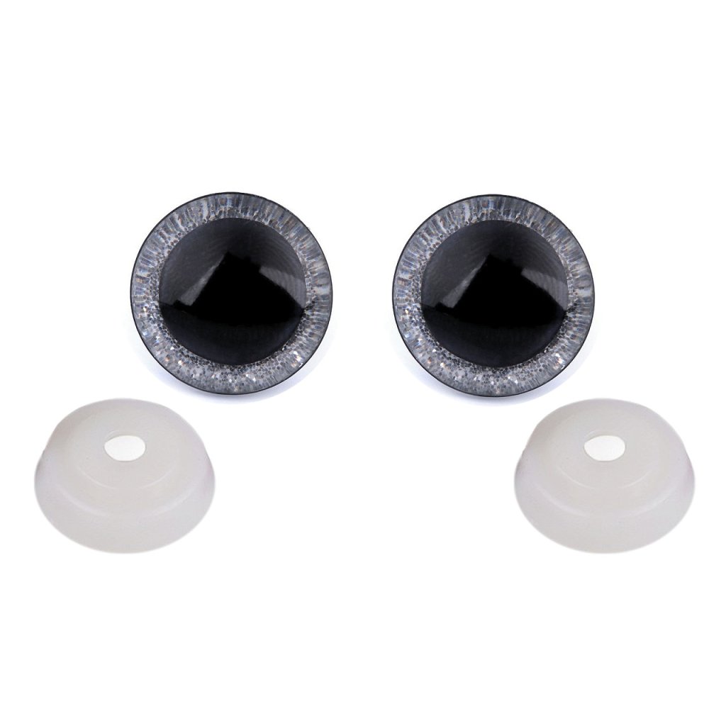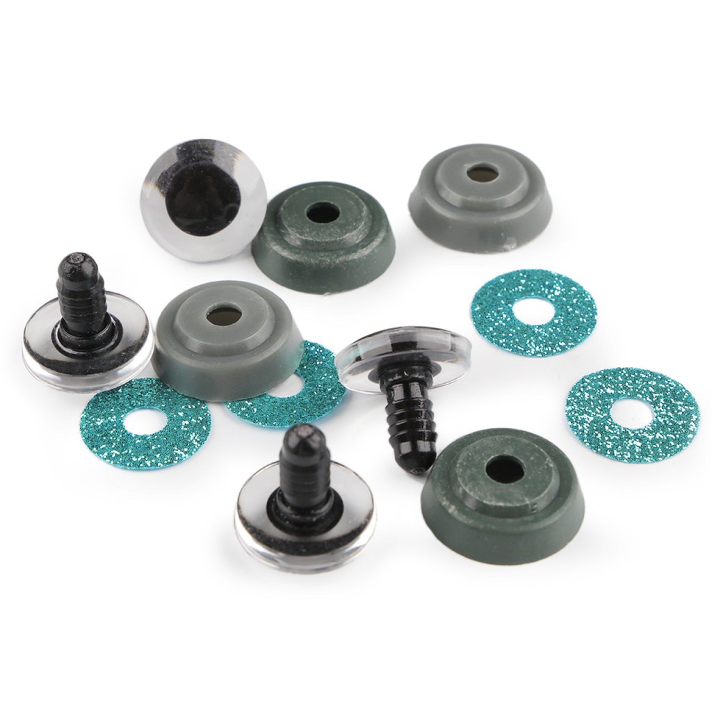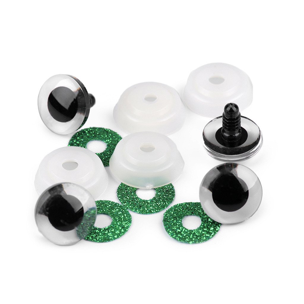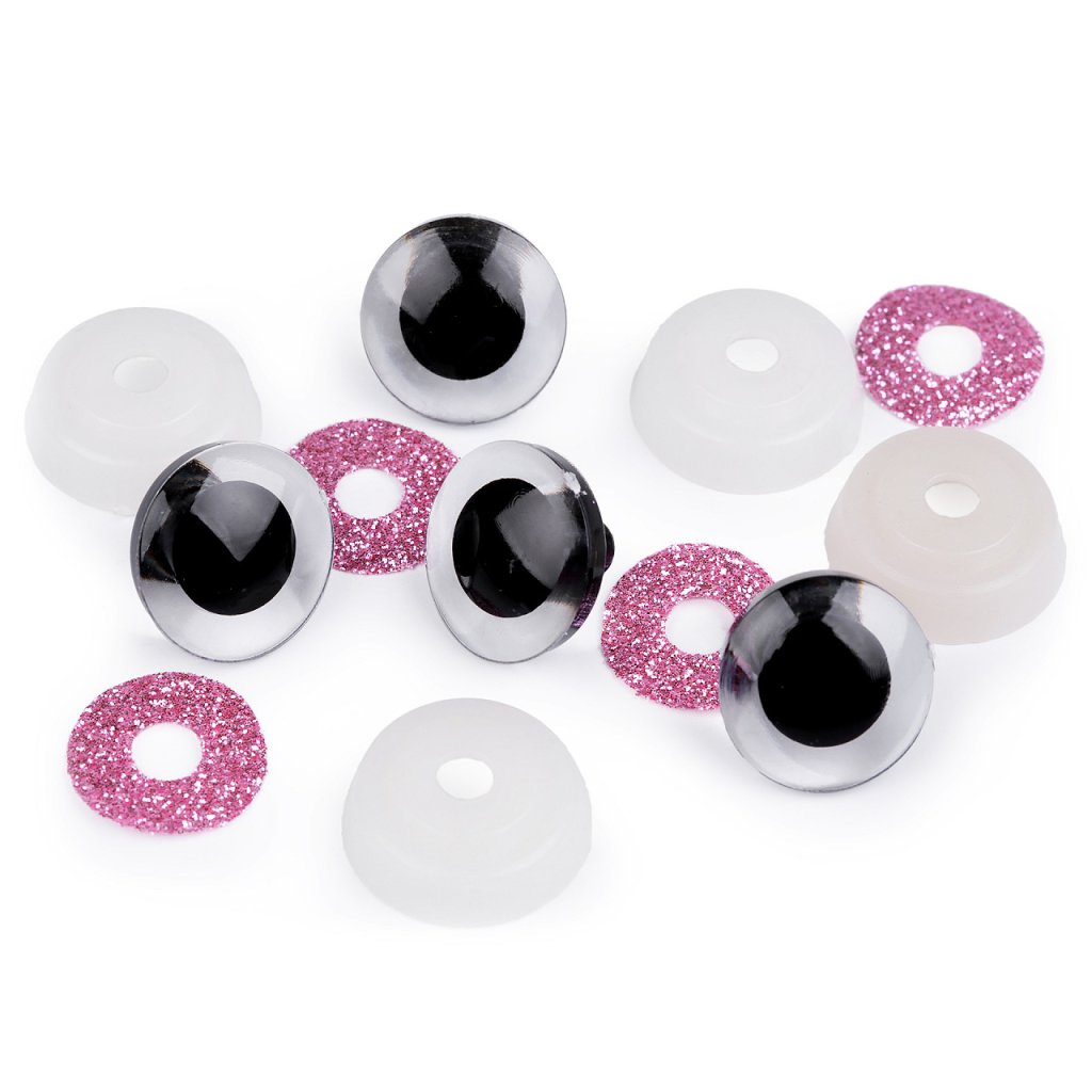 Polokulaté oči se třpytivou duhovkou umocní výraz vašich nejrůznějších postaviček či zvířátek. Mají závit, na který se nasadí duhovka, následně se provleče materiálem, a z druhé strany se pak nacvakne pojistka, která oči bezpečně připevní na místo. Pokud nebudete chtít, aby se oči třpytily, nemusíte duhovku použít, v tom případě zůstane duhovka transparentní.