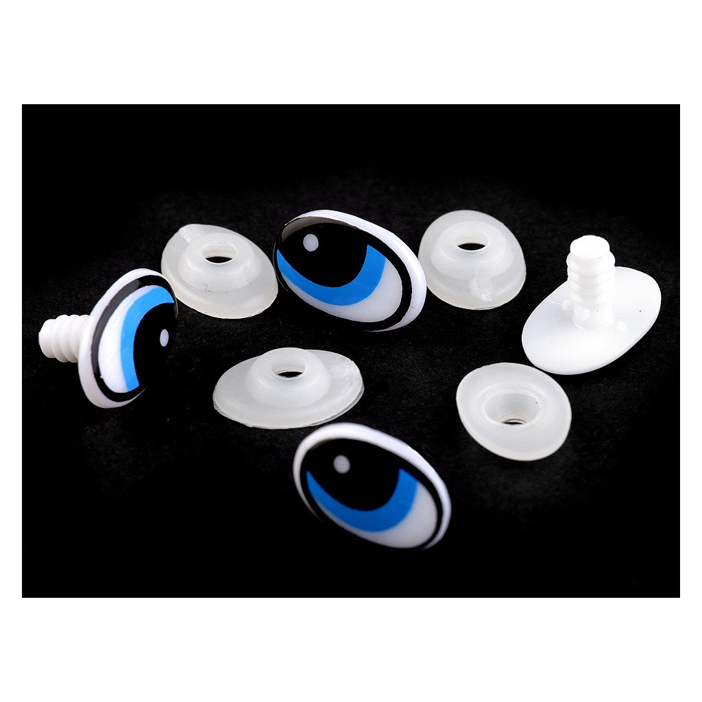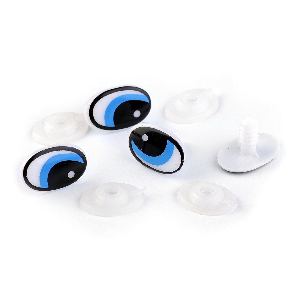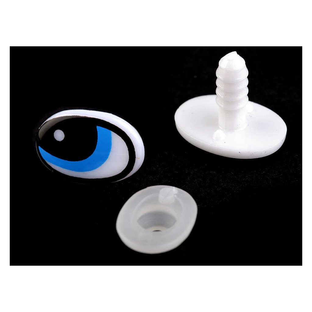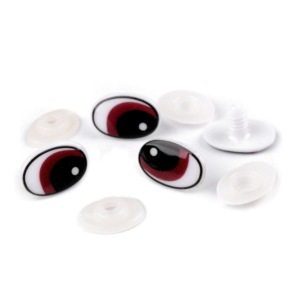 Oválné plastové oči s kvalitním barevným potiskem využijete pro výrobu různých postaviček a zvířátek z textilu, např. plyšáků. Pro pevné přichycení mají oči na vrutu závity, které se pevně uchytí v textilu. Z druhé strany se nacvakne pojistka, která oči bezpečně připevní na místo. Barva pojistky může lišit.