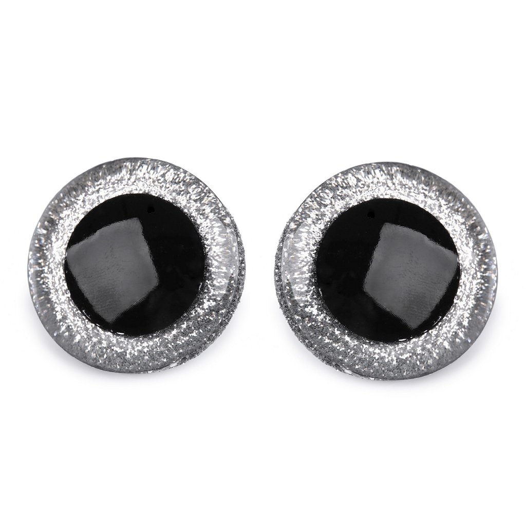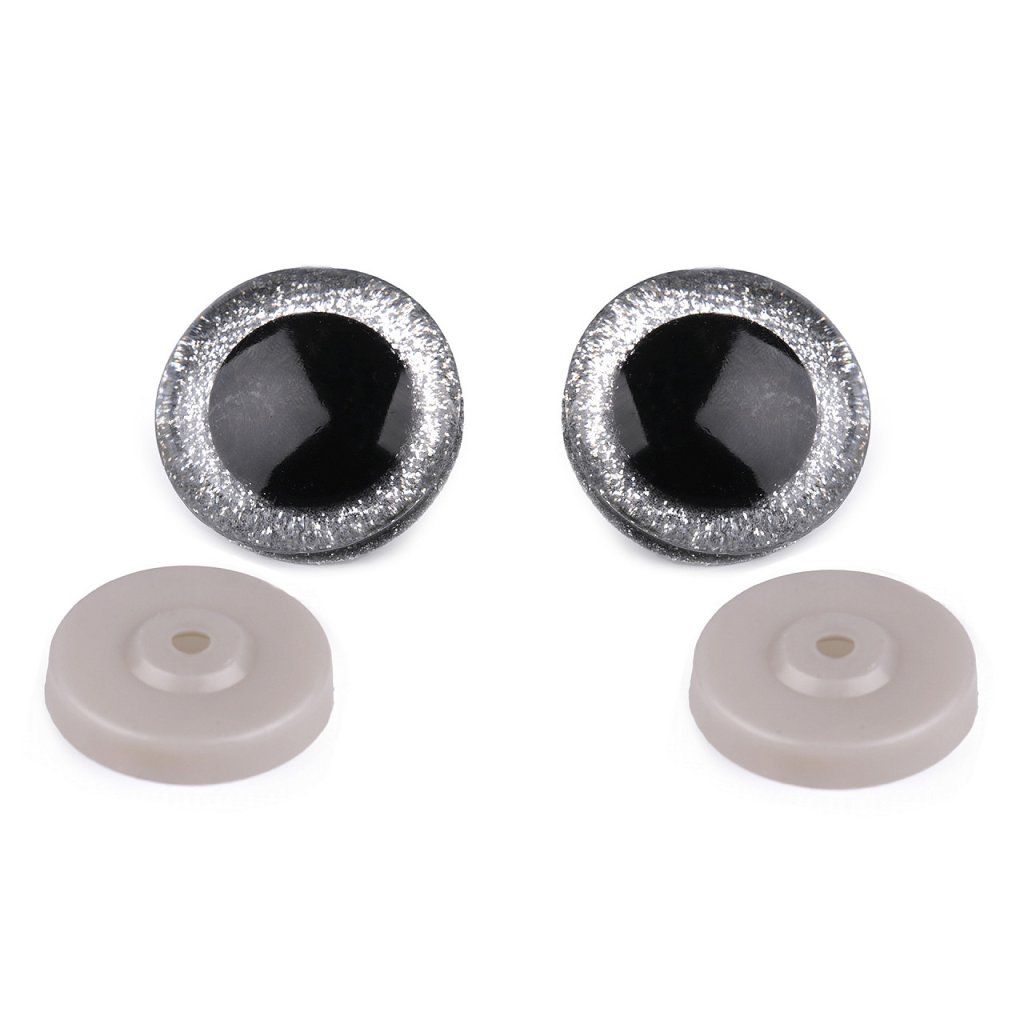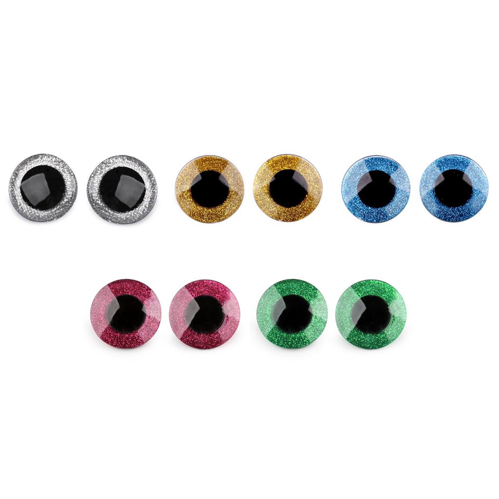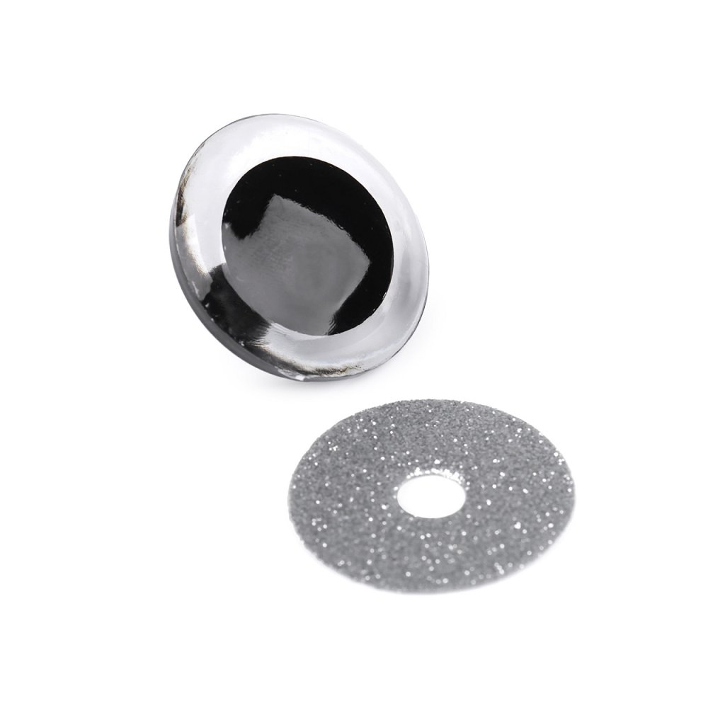 Velké polokulaté oči se třpytivou duhovkou umocní výraz vašich nejrůznějších postaviček či zvířátek. Mají závit, na který se nasadí duhovka, následně se provleče materiálem, a z druhé strany se pak nacvakne pojistka, která oči bezpečně připevní na místo. Pokud nebudete chtít, aby se oči třpytily, nemusíte duhovku použít, v tom případě zůstane duhovka transparentní.